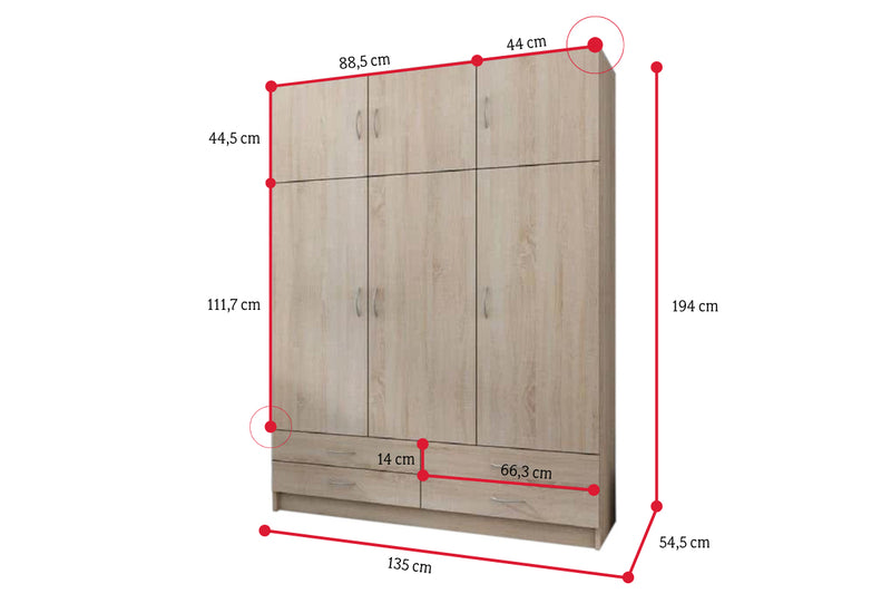Šatníková skriňa ANIMAL. Je vyrobená z kvalitného materiálu. Šesťdverová skriňa sa skladá v hornej časti z troch malých skriniek. Centrálna časť je klasická skriňa, ktorá má na ľavej a strednej časti šatníkové tyče. V pravej časti sú police. Súčasťou celého systému sú aj štyri šuplíky, ktoré sú umiestnené v spodnej časti. Vybrať si môžete z dvoch prírodných dekorov.