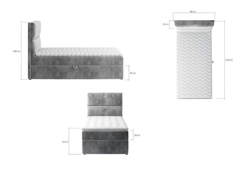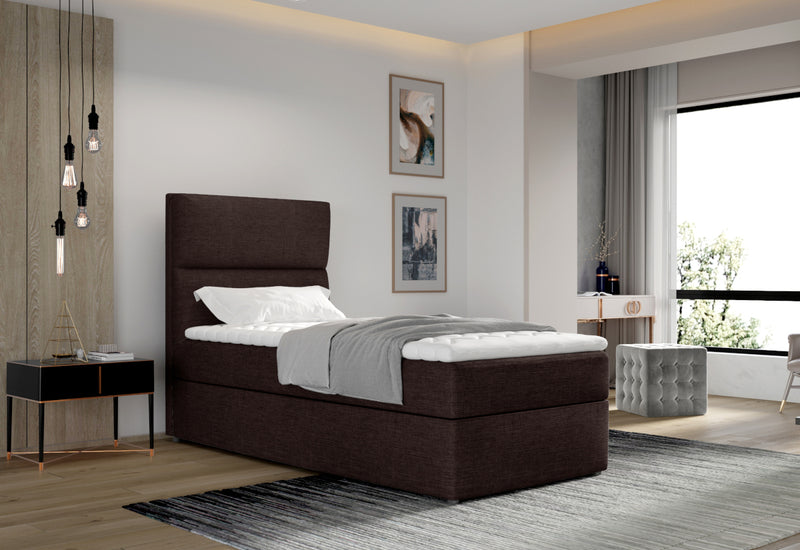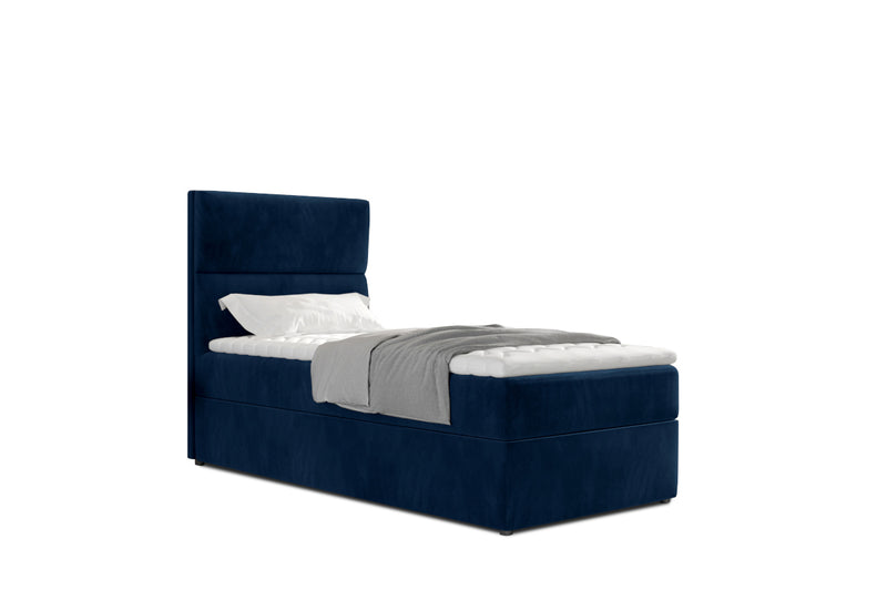 Čalúnená jednolôžková posteľ TRENTINO. Základ postele tvorí drevený rám a doska zaručujúce pevnosť a stabilitu. Zaujme vysokým prešívaným čelom, ktoré je výrazným prvkom. Matrace sú vyplnené kombináciou Bonellových pružín s PUR penou s tuhosťou H3. Pre väčšie pohodlie je k posteli dodaný vrchný Topper. Posteľ ponúka úložný priestor s bočným otváraním. Výber poťahových materiálov.
