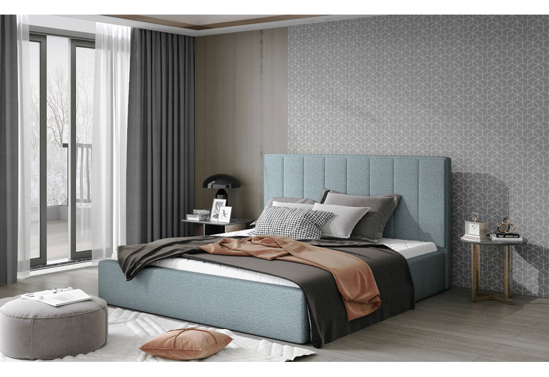 Čalúnená posteľ AUDRIA. Disponuje okrem iného úložným priestorom. Nad ním nájdete rošt v kovovom ráme s plynovou vzperou. Vybrať môžete zo štyroch rozmerov spacej plochy a z viac farebných čalúnení