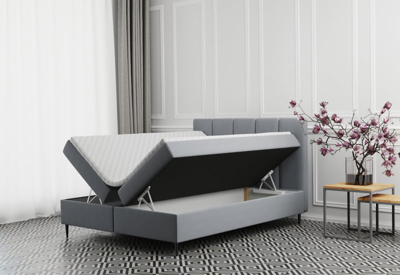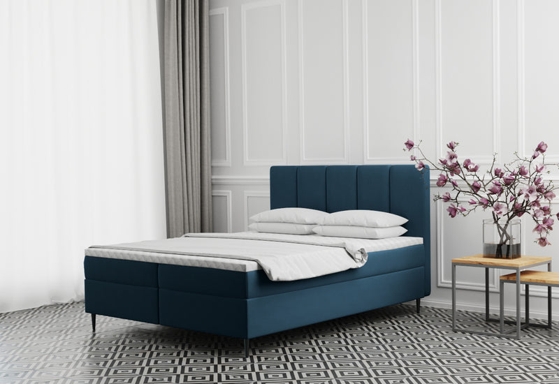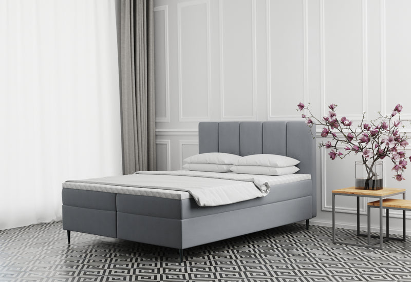 Čalúnená posteľ boxspring ADELE. Zaujme svojím jednoduchým dizajnom. Drevený rám postele zaručí stabilitu a pevnosť. Komfort vášho spánku zaistí Bonellový matrac. Vysoké čelo slúži počas dňa aj na relaxáciu. Výhodou postele je úložný priestor pod oboma spacími plochami. Súčasťou postele sú rošty. Vyššie nožičky zaisťujú stablitu a vzdušnosť. Vybrať môžete z viacerých farebných kombinácií a veľkostí spacej plochy.