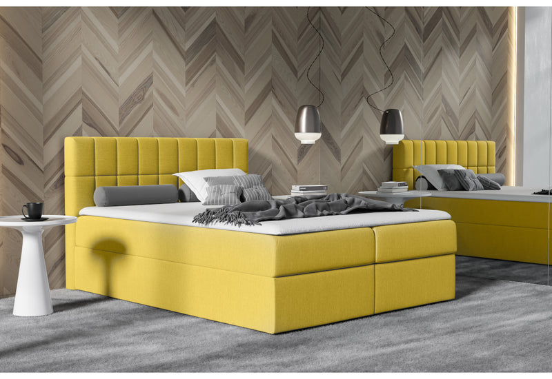 Čalúnená posteľ boxspring CARDIGEN. Dominantným prvkom je vysoké a mohutné čelo v modernom dizajne. Súčasťou postele je rošt a zabudovaný Bonellový matrac vyplnené penou T30. Vysoko flexibilný penový Topper zaistí pohodlie a komfort pri odpočinku. Úložný priestor s bočným otváraním nájdete pod matracmi. Možnosť voľby veľkosti spacej plochy a farby čalúnenia.