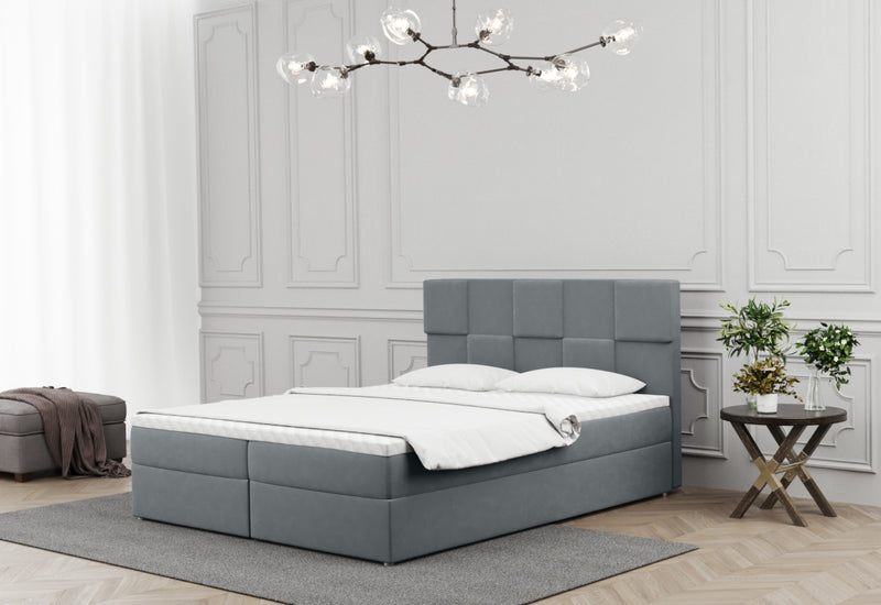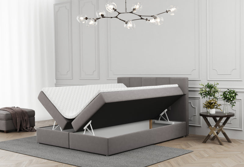 Čalúnená posteľ boxspring CHUCK. Dominantným prvkom je čelo s moderným dizajnom. Súčasťou postele je rošt a zabudované bonellové matrace vyplnené PUR penou. Flexibilný Topper zaistí pohodlie a komfort pri odpočinku. Zároveň slúži ako ochrana spacej plochy. Úložný priestor s bočným otváraním nájdete pod matracmi. Možnosť voľby veľkosti spacej plochy a farby čalúnenia.