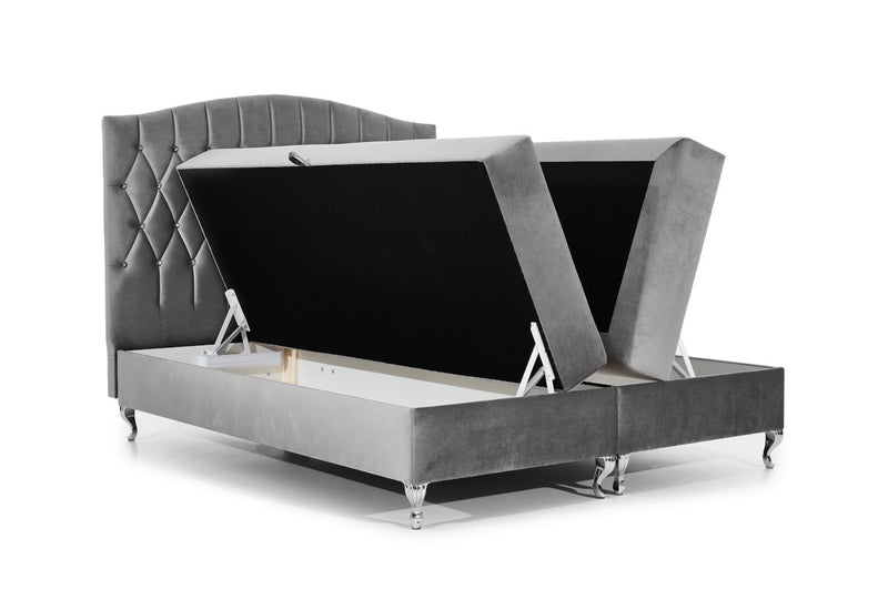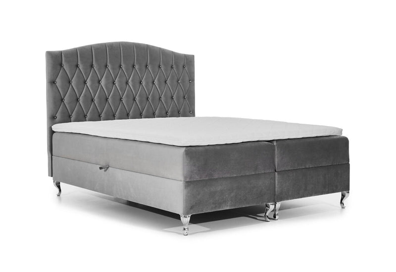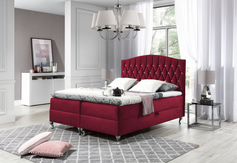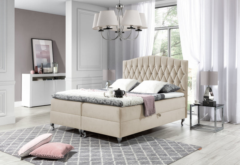 Čalúnená posteľ boxspring CRUZ. Prešívané čelo zdobené kryštálmi dodajú vzhľad luxusu. Súčasťou je rošt a zabudovaný matrac, ktorý obsahuje vysoko pružnú penu T30 a taštičkové pružiny pre maximálny komfort. Doplnok je 3 centimetrov vysoký topper s elastickou penou. Celá posteľ je postavená na kovových nožičkách striebornej farby. Pevnosť a stabilitu postele zaručí dobre spracovaný rám. Súčasťou sú úložné priestory pre posteľnú bielizeň. Vybrať si môžete z viacerých farieb a rozmerov spacej plochy.