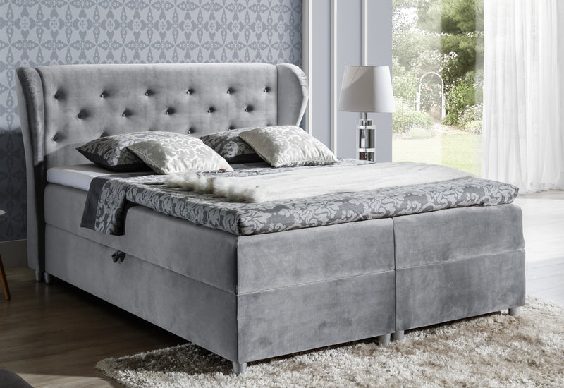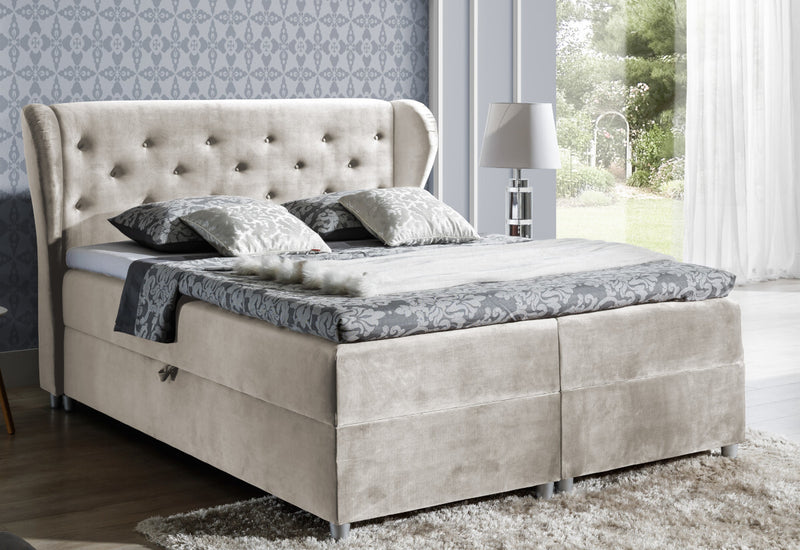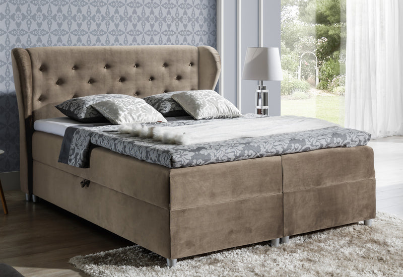 Čalúnená posteľ boxspring DESPASITO. Moderný dizajn a jednoduché línie. Komfortné spanie zaručí zabudovaná matrac s Topperom, ktorý dostanete zdarma. Úložný priestor tvorený za pomocou mechanického otvárania do boku. Matrac je položená na drevenom ráme a je tvorená taštičkovými pružinami s PUR penou T30. Vybrať môžete z ponuky dekorov a veľkosti spacej plochy.