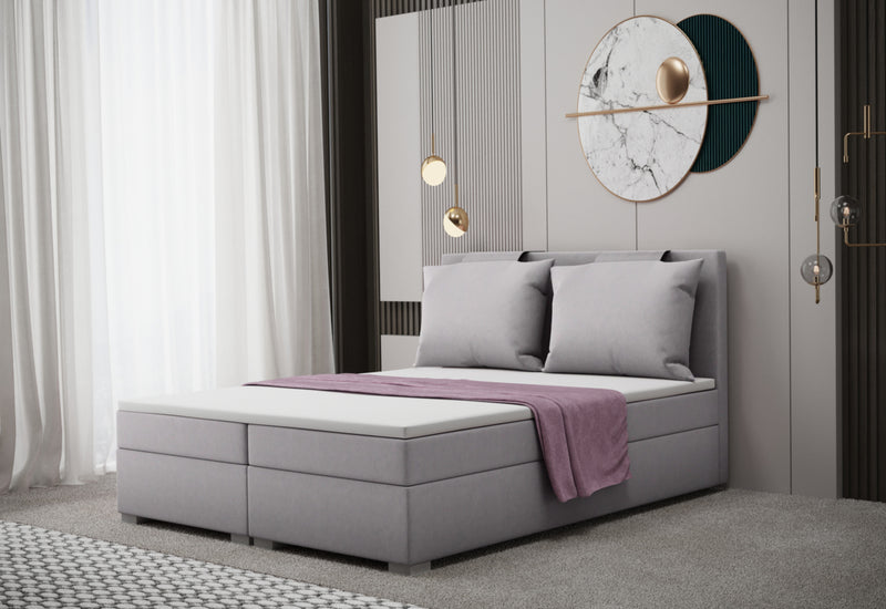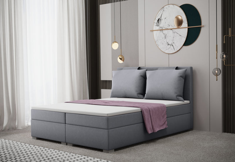 Čalúnená posteľ boxspring DINAMO. Zaujme svojim moderným dizajnom s rovnými líniami. Komfort Vášho spánku zaistí Bonellový matrac. Vysoké zdobené čelo slúži počas dňa aj na relaxáciu. Vrchná časť postele pokrýva Topper z elastickej peny. Výhodou postele je úložný priestor pod oboma spacími plochami. Súčasťou postele sú rošty a dva veľké vanúše, ktoré sú odnímateľné pomocou suchého zipsu. Nižšie nožičky zaisťujú stablitu a vzdušnosť. Vybrať môžete z viacerých farebných kombinácií a veľkostí spacej plochy.