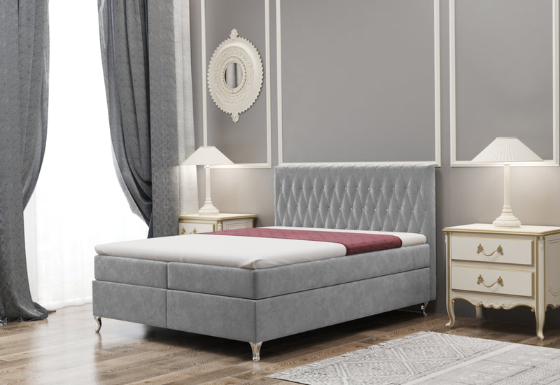 Čalúnená posteľ boxspring DOUGLAS. Zaujme svojim elegantným dizajnom. Komfort vášho spánku zaistí bonellový matrac. Vysoké čelo slúži počas dňa aj na relaxáciu. Vrchnú časť postele pokrýva topper z elastickej peny. Výhodou postele je úložný priestor pod oboma spacími plochami. Súčasťou postele sú rošty. Vyššie nožičky zaisťujú stablitu a vzdušnosť. Vybrať si môžete z viacerých farebných kombinácií a spacej plochy.