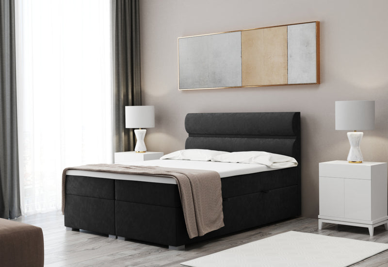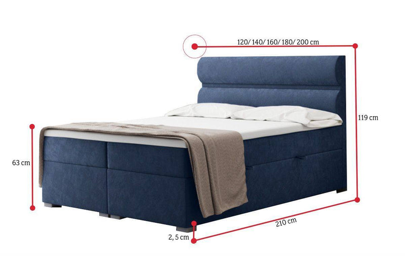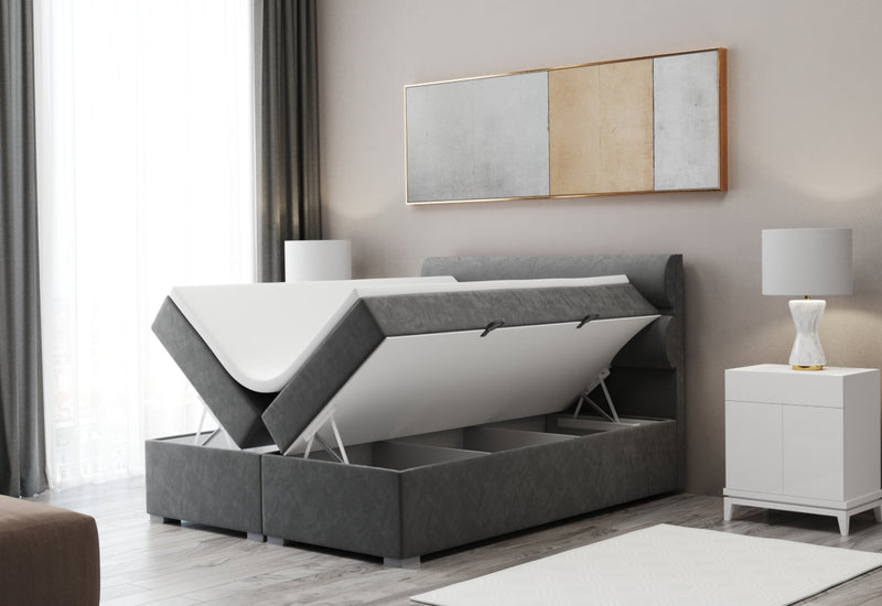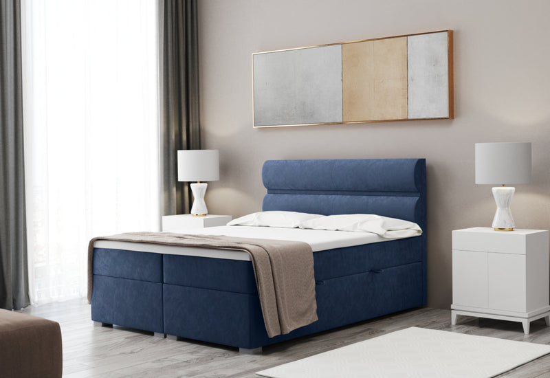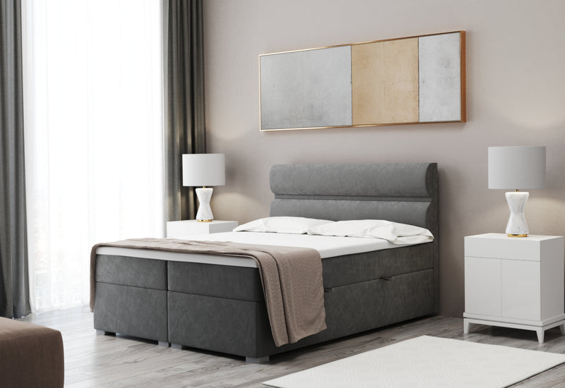 Čalúnená posteľ boxspring FELTA. Dominantným prvkom je vysoké čelo. Súčasťou postele je rošt a zabudovaný bonellový matrac vyplnený penou. Flexibilný topper zaistí pohodlie a komfort pri odpočinku. Zároveň slúži ako ochrana spacej plochy. Úložný priestor s bočným otváraním nájdete pod matracmi. Možnosť voľby rozmerov a farieb čalúnenia.
