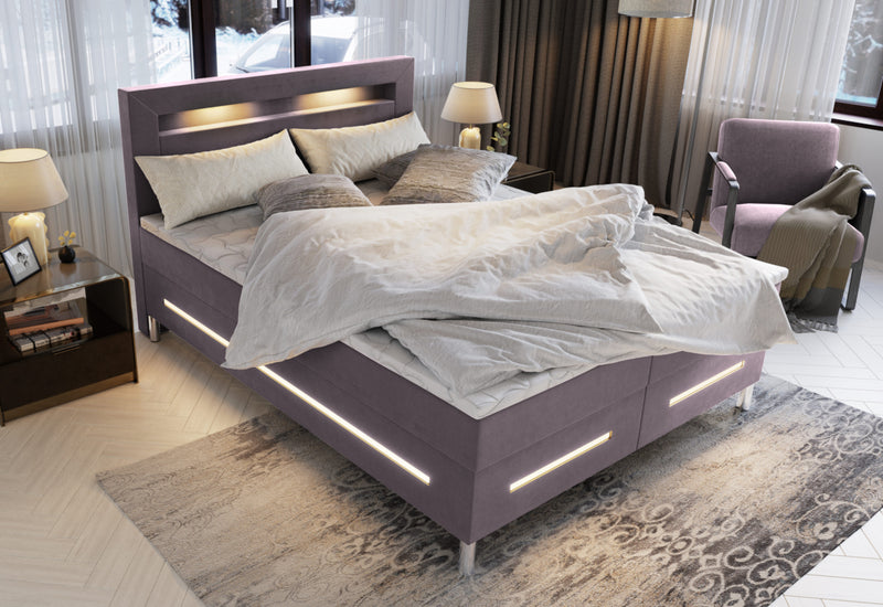 Čalúnená posteľ boxspring FRIENDS. Zaujme jednoduchými líniami moderného štýlu a podsvietením, ktoré zaistí LED osvetlenie. Vďaka vyšším nožičkám posteľ pôsobí vzdušne. Základ tvorí rám, ktorý zaistí pevnosť a stabilitu. Súčasťou postele je rošt a zabudovaný bonellový matrac vyplnený PUR penou T25 a topper z rovnakého materiálu. Posteľ disponuje veľkým množstvom úložného priestoru, ktorý sa nachádza pod matracmi s bočným otváraním. Možnosť voľby z viacerých rozmerov spacej plochy a čalúnenia.