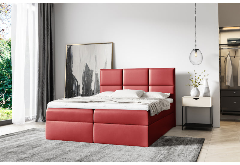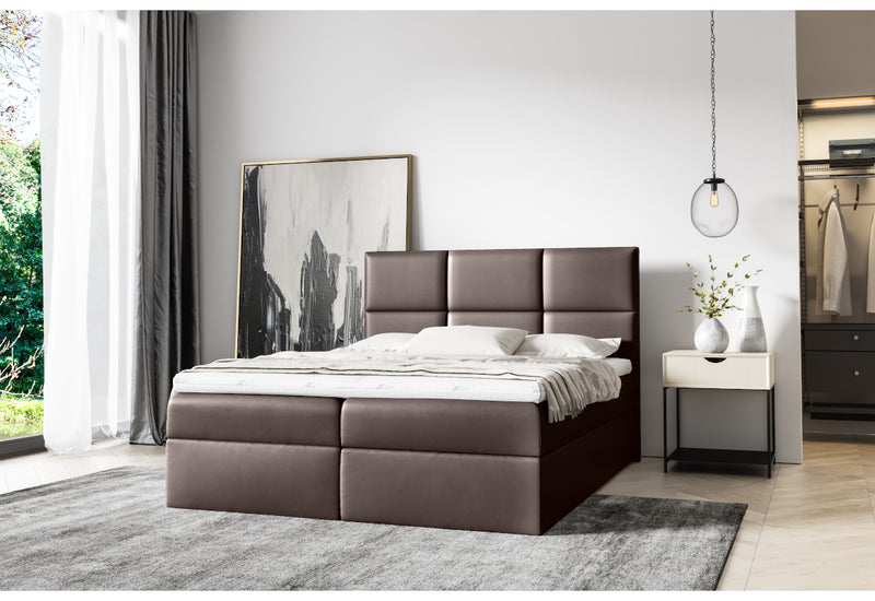 Čalúnená posteľ boxspring IZMIR. Dominantným prvkom je vysoké a mohutné čelo v modernom dizajne. Súčasťou postele je rošt a zabudovaný bonellový matrac vyplnený penou T30. Vysoko flexibilný penový Topper zaistí pohodlie a komfort pri odpočinku. Úložný priestor s bočným otváraním nájdete pod matracmi. Možnosť voľby veľkosti spacej plochy a farby čalúnenia.