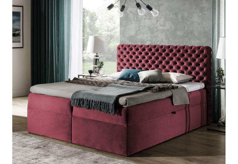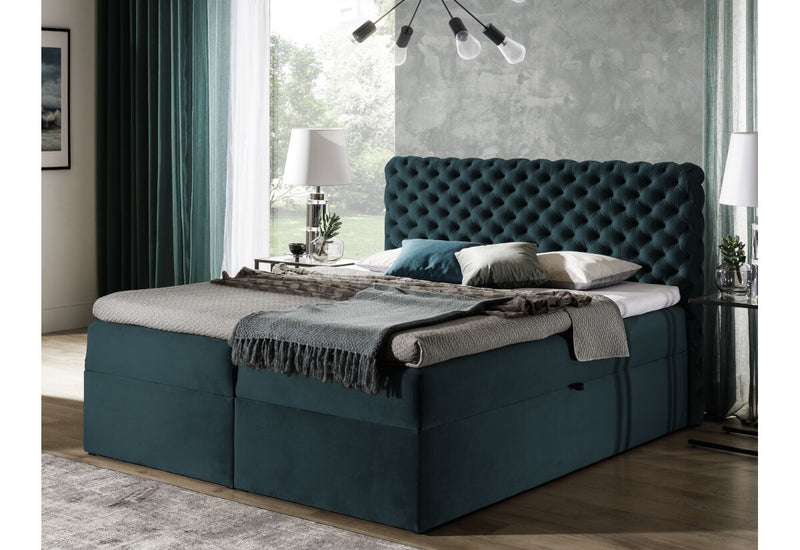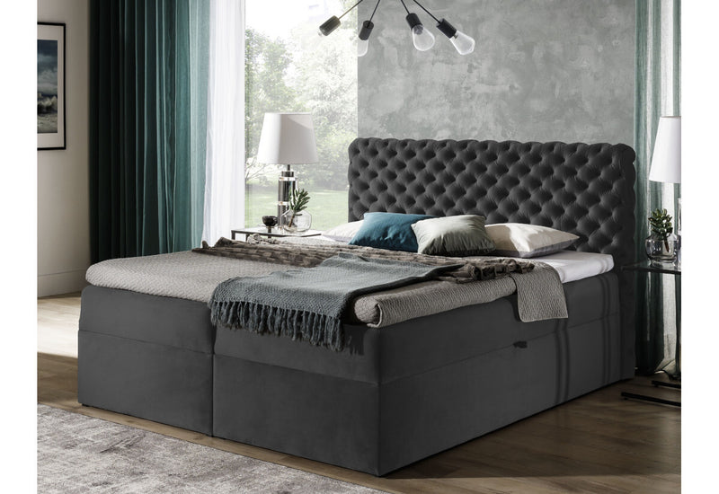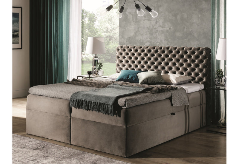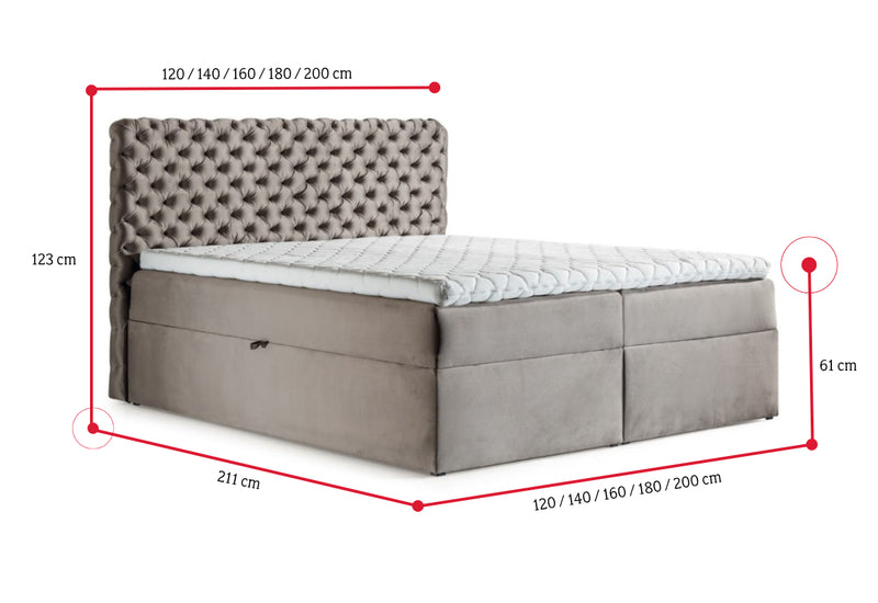 Čalúnená posteľ boxspring MARCH + topper. Moderný dizajn a jednoduché línie. Komfortné spanie zaručí zabudovaný matrac s topperom hrubým 3 cm, ktorý dostanete zadarmo. Úložný priestor je tvorený pomocou mechanického otvárania do boku. Matrac je položený na ráme a je tvorený taštičkovými pružinami s PUR penou T30. Vybrať si môžete z ponuky dekorov a spacej plochy.