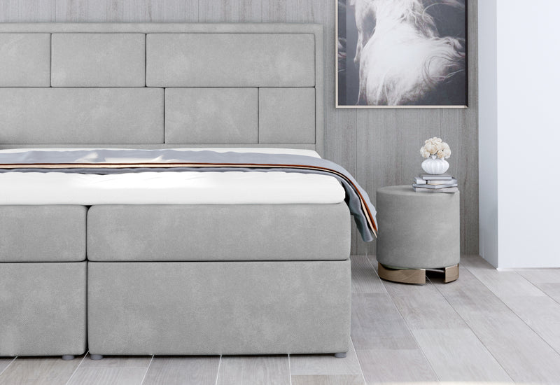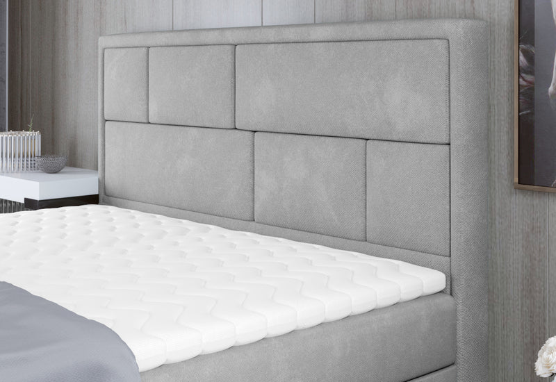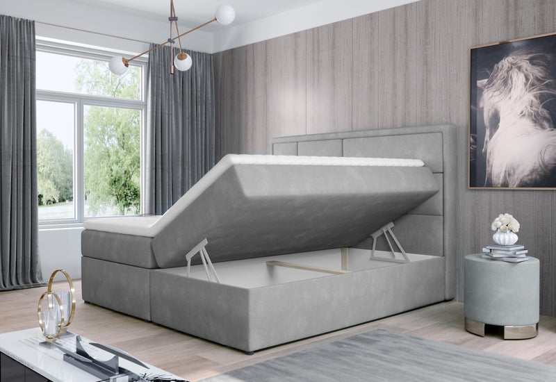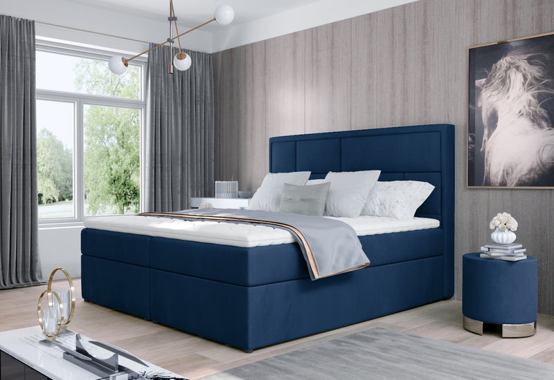Čalúnená posteľ boxspring MARON. Dominantným prvkom je vysoké a mohutné čelo v modernom dizajne. Súčasťou postele je rošt a zabudovaná bonellové matraca vyplnená penou T25 o tuhosti H3. Topper s hypoalergénnym poťahom zaistí dokonalé pohodlie. Poťah topperu je prateľný pri teplote 40 ° C. Úložný priestor nájdete pod matracmi, otvára sa z boku. Vyberať môžete z niekoľkých farebných variantov.