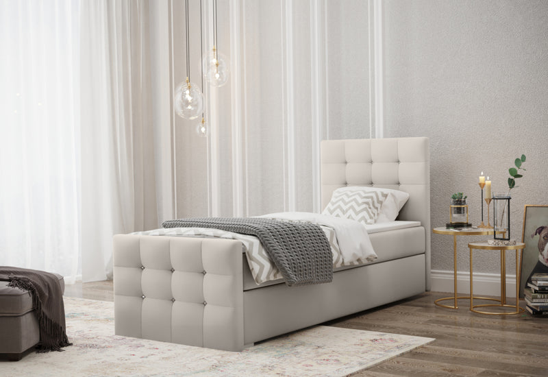 Čalúnená posteľ boxspring MARTYN. Zaujme jednoduchými líniami a moderným štýlom. Dominantným prvkom je veľké prešívané čelo s krištáľmi. Vyvýšená spacia plocha vám zaistí príjemné vstávanie. Veľkou výhodou je úložný priestor. Komfort pri spánku a relaxácii zaistí bonellový matrac a penový topper. Môžete si vybrať z viacerých rozmerov a farieb.