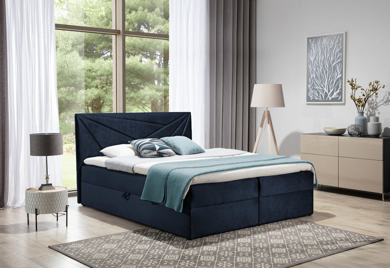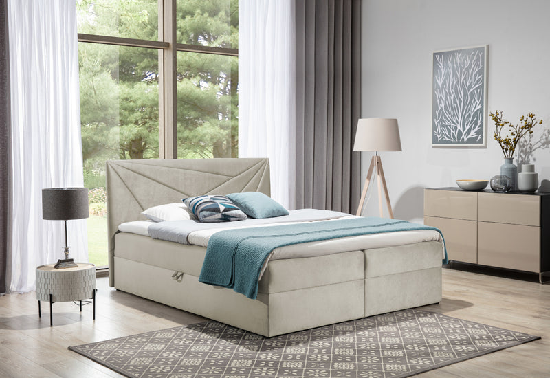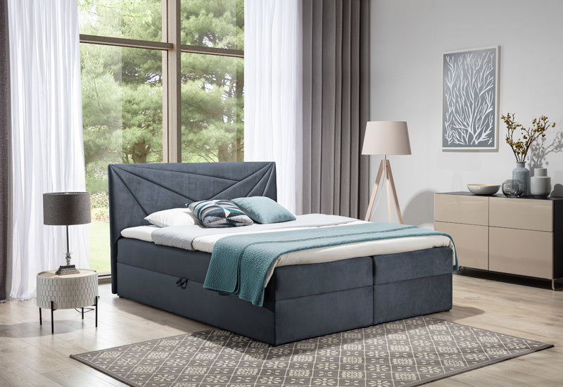 Čalúnená posteľ boxspring NUMBER 5. Dizajnové prešívané čelo vhodné aj na opretie pri relaxácii. Súčasťou je topper a zabudovaný bonellový matrac s roštom a s tvrdosťou H3. Úložné priestory sa nachádzajú pod matracmi s automatickým mechanizmom. Vybrať si môžete z viacerých farieb a rozmerov spacej plochy.