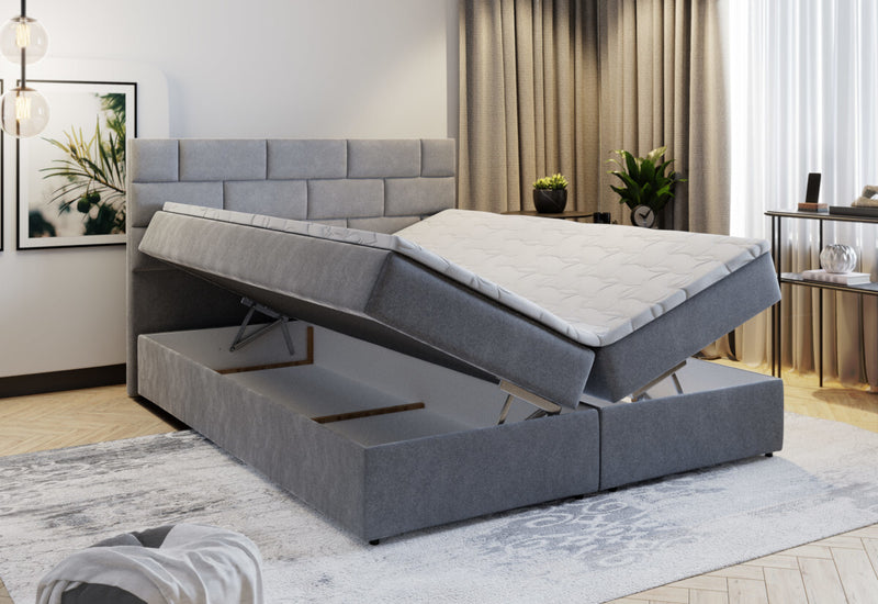 Čalúnená posteľ boxspring PERLA. Zaujme jednoduchými líniami moderného štýlu a svojim vyšším prešívaným čelom, ktoré poslúži počas dňa na relaxáciu. Základ tvorí rám, ktorý zaistí pevnosť a stabilitu. Súčasťou postele je rošt a zabudovaný bonellový matrac vyplnený PUR penou T25 a topper z rovnakého materiálu. Posteľ disponuje veľkým množstvom úložného priestoru, ktorý sa nachádza pod matracmi s bočným otváraním. Možnosť voľby z viacerých rozmerov spacej plochy a čalúnenia.