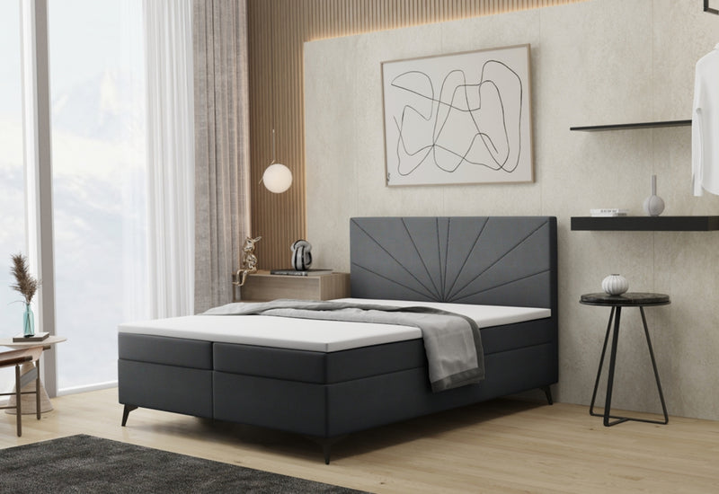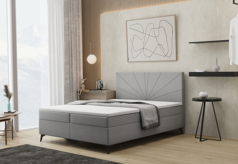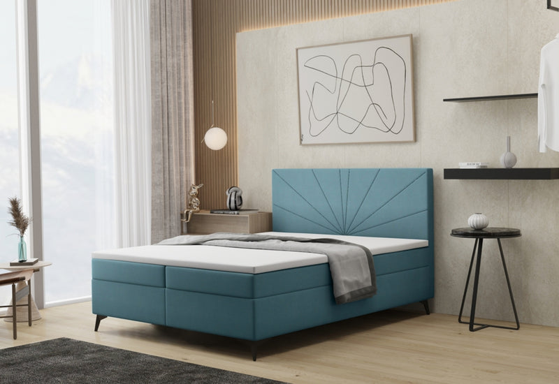 Čalúnená posteľ boxspring ROUSE. Dominantným prvkom je vysoké čelo s dekoračným prešívaním. Súčasťou postele je rošt a zabudovaný Bonellový matrac vyplnený penou. Flexibilný penový Topper zaistí pohodlie a komfort pri odpočinku. Zároveň slúži ako ochrana spacej plochy. Úložný priestor s bočným otváraním nájdete pod matracmi. Možnosť voľby veľkosti spacej plochy a farby čalúnenia.