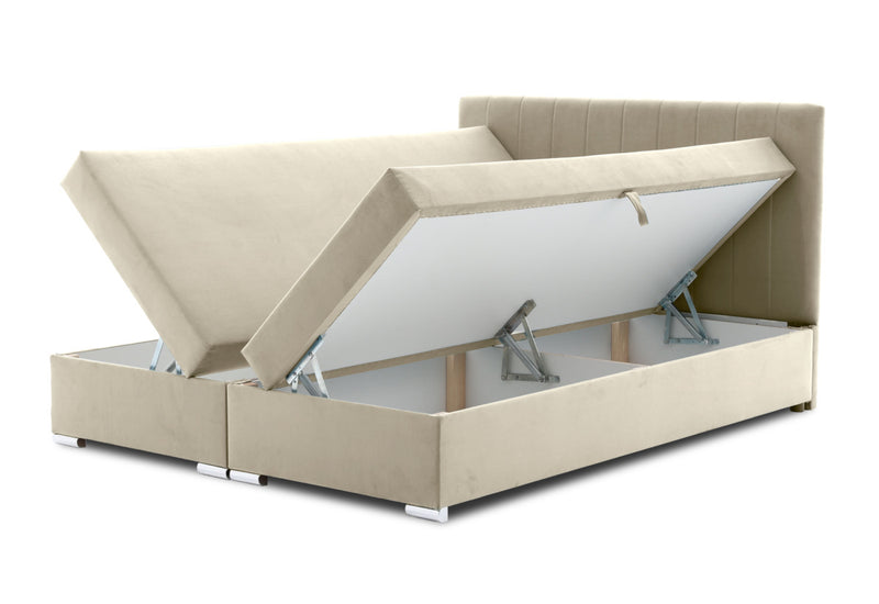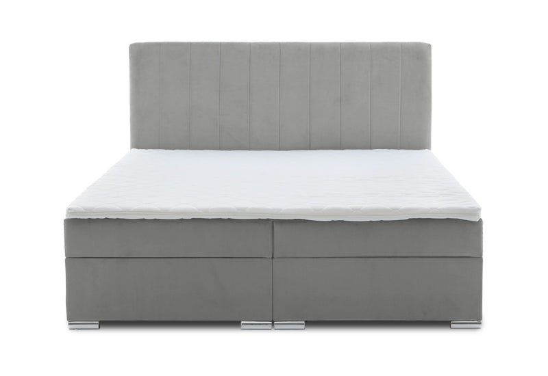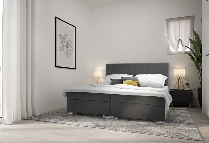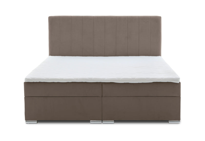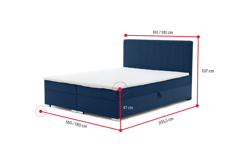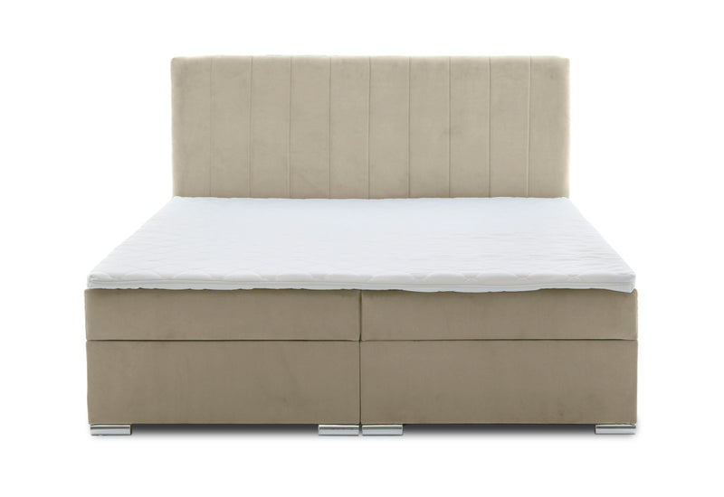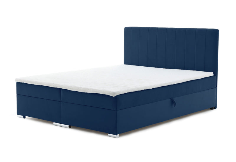 Čalúnená posteľ boxspring WILDE. Posteľ s jednoduchými líniami a dekoračným prešitím čela v modernom štýle. Vysoké čelo je vhodné aj na oddych a relaxáciu. Pevnosť a stabilitu postele zaručí dobre spracovaný rám. Súčasťou je topper a zabudovaný bonellový matrac s roštom. Úložné priestory sa nachádzajú pod matracmi s automatickým mechanizmom. Stojí na nižších kovových nožičkách pre väčšiu stabilitu. Vybrať si môžete z viacerých farieb a rozmerov spacej plochy.