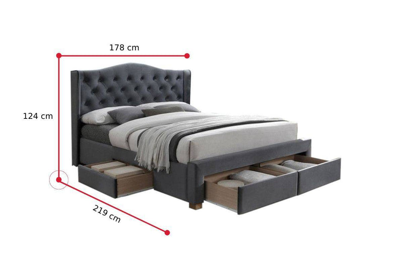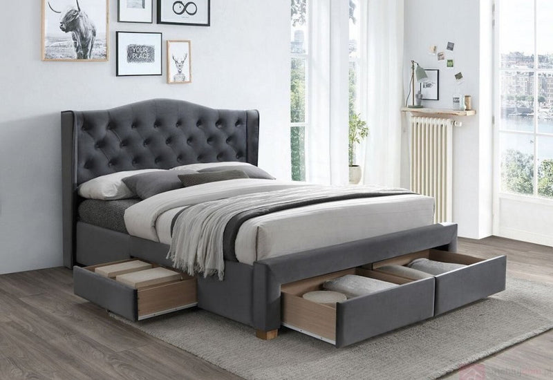 Čalúnená posteľ CADERA Velvet II Vás zaujme jedinečným a elegantným vzhľadom. Rám postele je potiahnutý na dotyk príjemnou látkou. Súčasťou postele je lamelový rošt a 4 úložné zásuvky. Posteľ s prešívaným čelom a nízkymi nohami v prírodnom dekore sa skvele hodí do každej modernej spálne. Vyberať môžete z viacerých ponúkaných farieb.