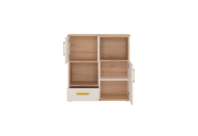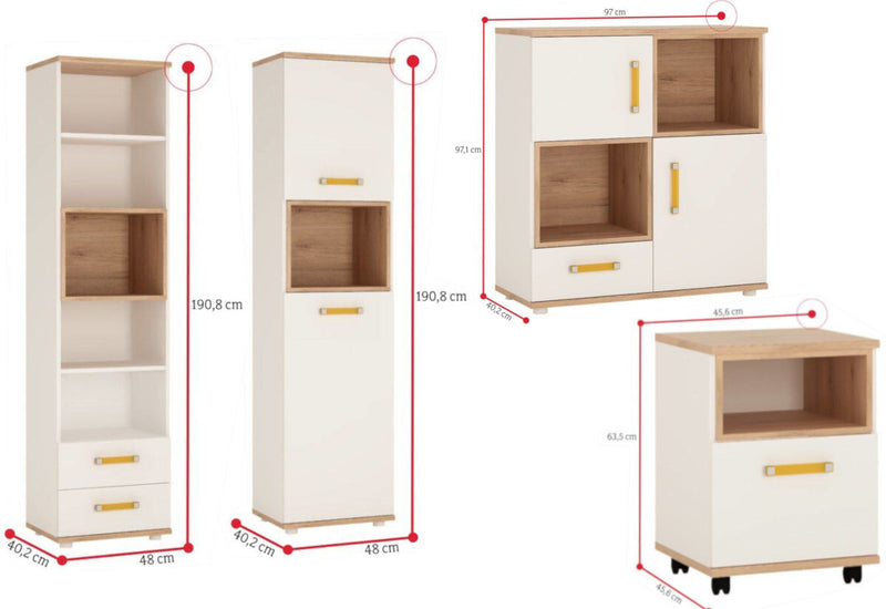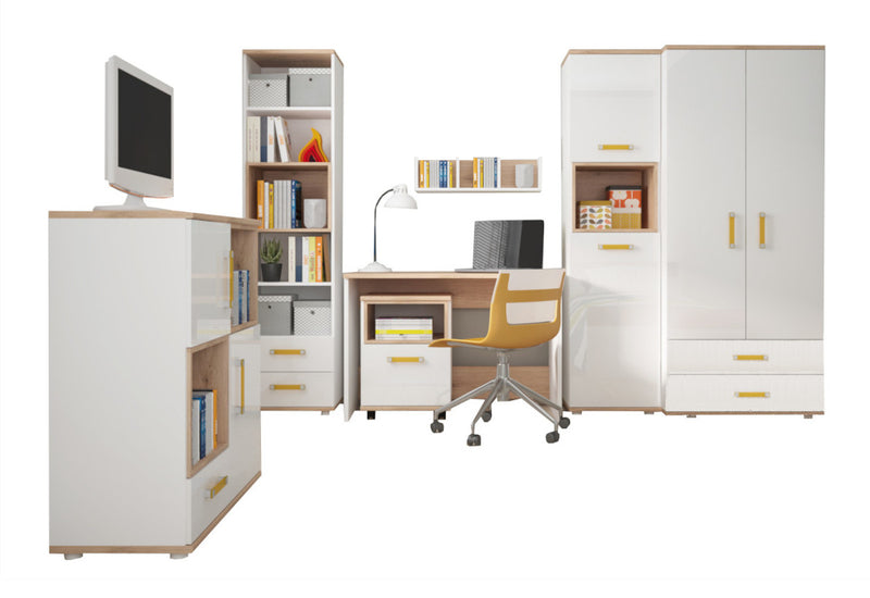 Detská izba AZAN 2. Moderná detská izba Vás zaujme svojim jednoduchým dizajnom. Je vyrobená z kvalitných materiálov. Skladá sa z komody, šatníkovej skrine, dvoch vysokých regálov, písacieho stola, kontajnera a jednej police. Produkty sa dajú zakúpiť aj samostatne, vďaka tomu si môžete vytvoriť detskú izbičku podľa Vášho priania.