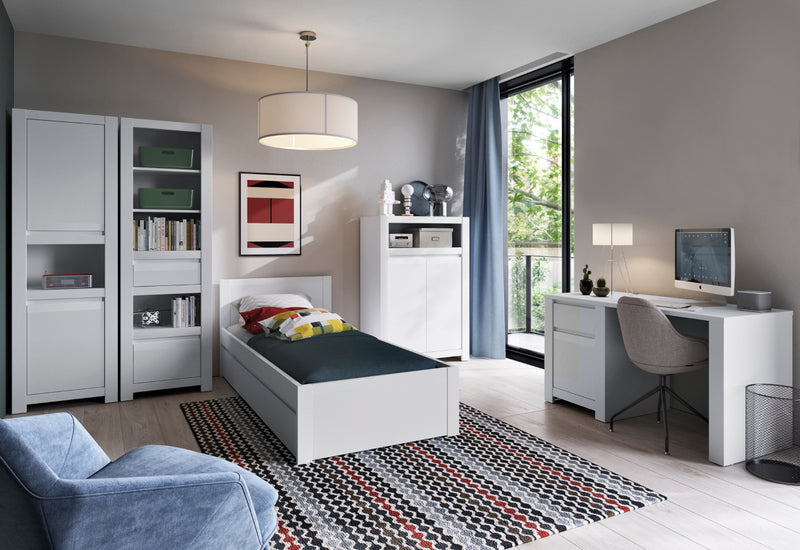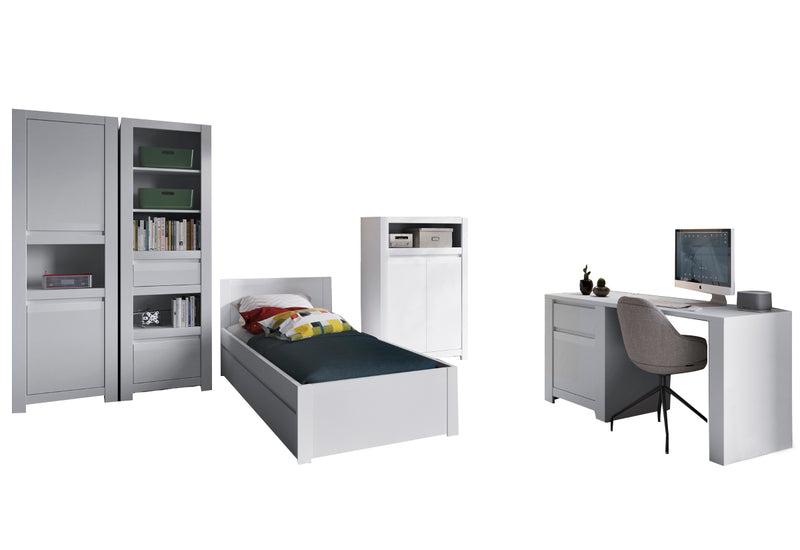 Detská izba MANOL. Moderná detská izba Vás zaujme svojim jednoduchým dizajnom. Je vyrobený z kvalitných materiálov. Skladá sa z komody, postele, dvoch vysokých regálov a písacieho stola. Produkty sa dajú zakúpiť aj samostatne, vďaka tomu si môžete vytvoriť detskú izbu podľa Vášho priania.