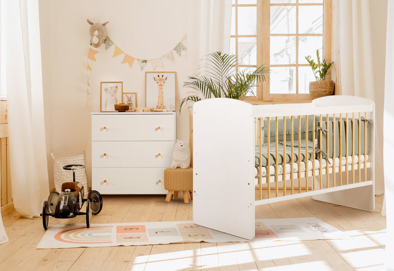 Detská izba ROLINS. Moderná detská izba vyrobená z kvalitného lamina, kvalitnej drevotrieskovej dosky a MDF dosky. Detská izbička sa skladá iba z dvoch produktov a to detskej komody a detskej postieľky s roštom. Matrac nie je súčasťou postieľky. Korpus nábytku je v bielej farbe. Možnosť zakúpenia produktov samostatne, vďaka tomu si môžete vytvoriť detskú izbičku podľa vášho priania.