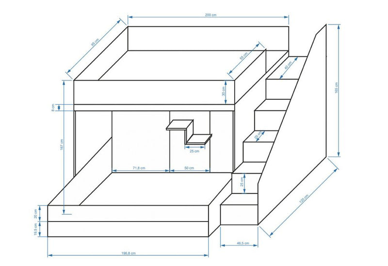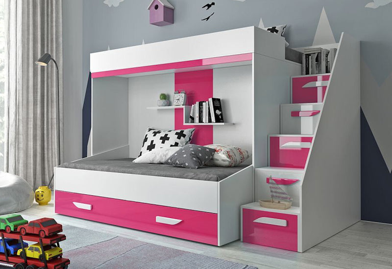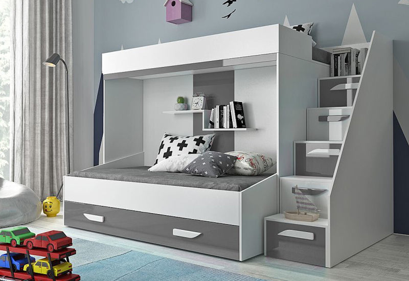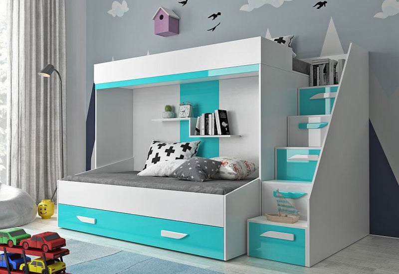 Detská poschodová posteľ AKTION 16 Plus. Posteľ s dvoma lôžkami, ktorá kombinuje moderný dizajn a praktickosť. Na výrobu sa používajú laminátové dosky s hrúbkou 1,6 cm, ktoré sú opatrené ABS hranami. Obe lôžka sú bez matraca s doskou nahrádzajúci rošt. Rozmer hornej spacej plochy je 90x200, spodná 90x195 cm. Zásuvka a polička ponúka dostatok úložného priestoru. Predna strana dvierok a zásuviek sú v lesklom prevedení, ostatné časti sú matne. Možnosť výberu farieb. Variant so schodmi.