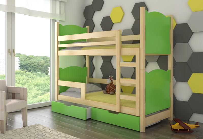 Detská poschodová posteľ BALADA 2. Detská poschodová posteľ zaujme svojou jednoduchosťou doplnenou pastelovými farbami. Je vyrobená v kombinácii borovicového dreva s kvalitným materialom s ABS hranou, ktorá chráni pred mechanickým poškodením. Komfort zaručí matrac z kvalitnej PUR peny s roštom, ktoré sú súčasťou postele. V spodnej časti nájdete úložný priestor v podobe dvoch šuplíkov. Pre pohodlné otváranie sú šuplíky opatrené výrezom. Možnosť výberu z viacerých farieb.