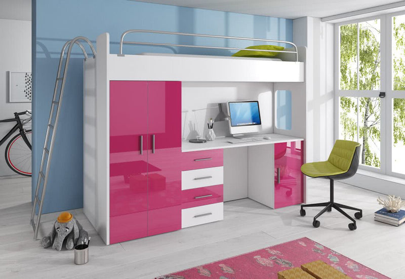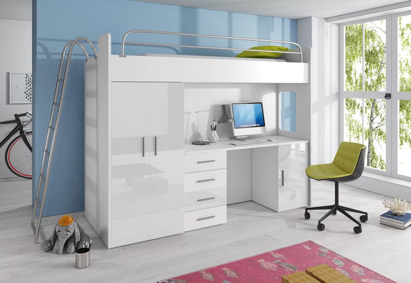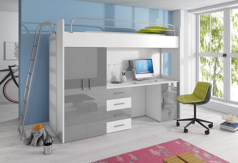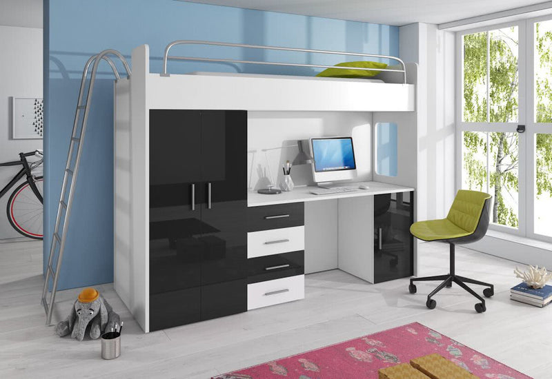 Detská poschodová posteľ DARCY IVd. Posteľ s moderným dizajnom a dokonale premyslenú funkčnosťou. Lôžko je riešením malých priestorov. Poskytne vám posteľ, skriňu aj písací stôl v jednom. Predné časti nábytku sú vyrobené z vysoko kvalitného materiálu MDF. Horná spacie lôžko disponuje bezpečnostnou zábranou, ktorá ochráni vaše dieťa. Prístup k lôžku riešený rebríkom. Orientáciu si môžete ľubovoľne zvoliť sami. Posteľ dodávaná bez matraca. Rošt je súčasťou.