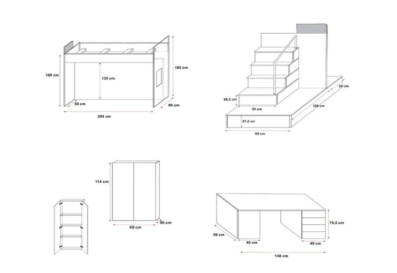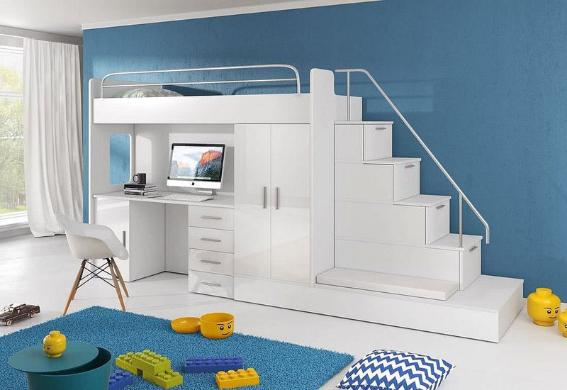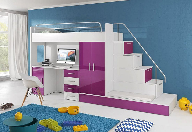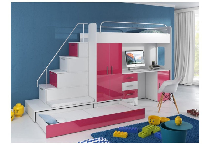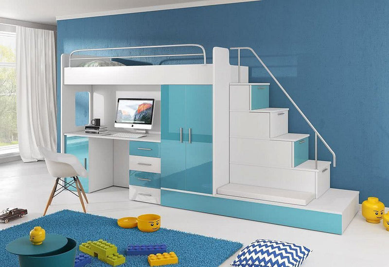 Detská poschodová posteľ DARCY V COLOR. Posteľ kombinuje moderný design a funkčnosť. Vhodná do malých priestorov. Posteľ poskytne prístelku, skriňu, písací stôl a schody s úložným priestorom. Pri výrobe boli použité laminátové dosky so zvýšenou odolnosťou proti poškriabaniu s hrúbkou 1,6 cm. Farebné časti sú pokryté akrylovou fóliou pre lesklý efekt. Hrany sú opatrené PCV. Horné lôžko je dodávané bez matrac. K prístelke vám dodáme aj matrac. Lôžko aj prístelka sú s roštom. Možnosť výberu farebných variantov.