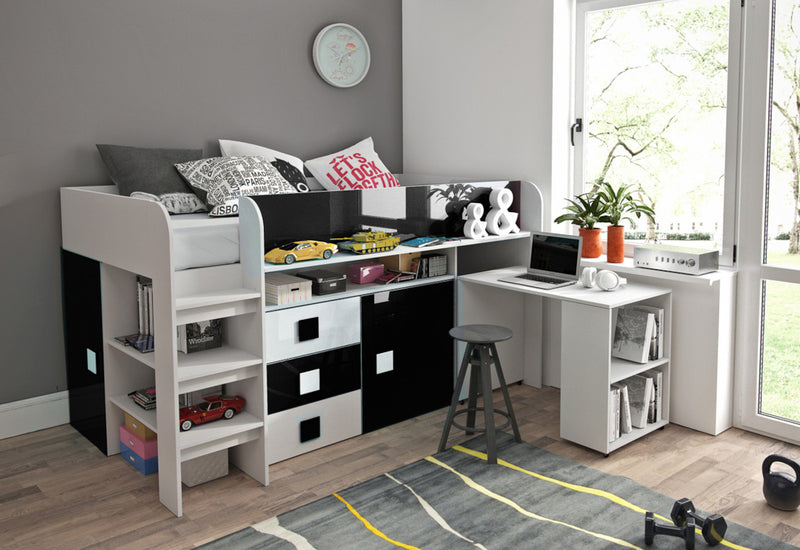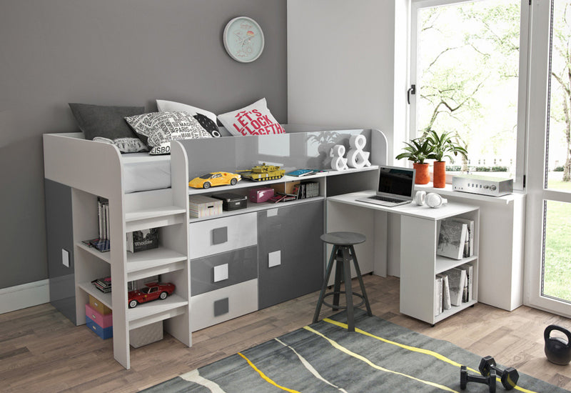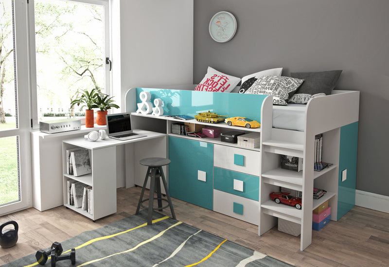 Detská poschodová posteľ LEON 1 Plus. Posteľ kombinuje moderný design a funkčnosť. Horné lôžko má bezpečnostnú zábranu. Je vhodná do malých priestorov. Posteľ poskytne zároveň výsuvný písací stôl a veľa úložného priestoru. Konštrukcia je vyrobená z kvalitného lamina hrúbky 1,6 cm. Hrany sú s ABS hranou, ktorá chráni materiál pred mechanickým poškodením a vlhkosťou. Horné lôžko je dodávané bez matraca. Možnosť výberu farieb.