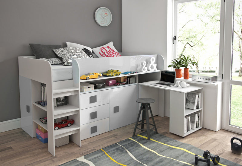 Detská poschodová posteľ LEON 1. Posteľ kombinuje moderný design a funkčnosť. Horné lôžko je opatrené bezpečnostnou zábranou. Vhodná do malých priestorov. Posteľ poskytne zároveň výsuvný písací stôl a veľa úložného priestoru. Konštrukcia je vyrobená z kvalitného lamina hrúbky 1,6 cm. Hrany sú opatrené ABS hranou, ktorá chráni materiál pred mechanickým poškodením a vlhkosťou. Horné lôžko je dodávané bez matraca. Možnosť výberu farebných variantov.