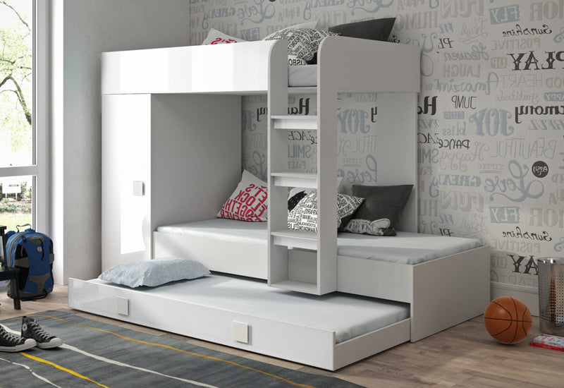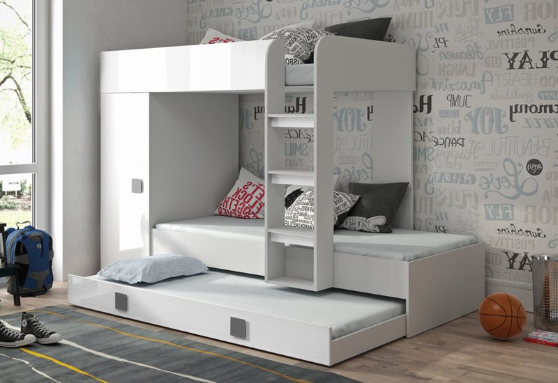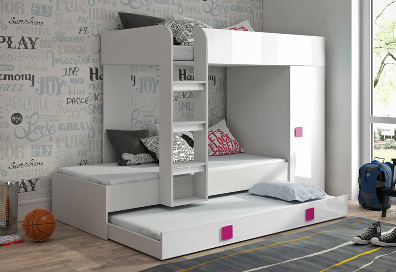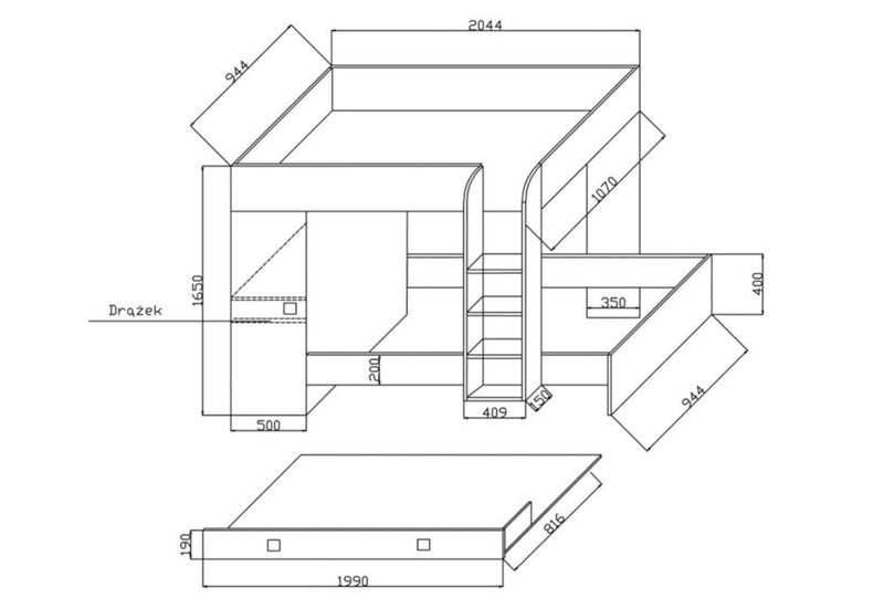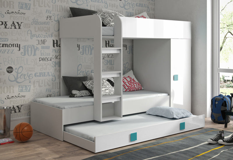 Detská poschodová posteľ LEON 2. Posteľ kombinuje moderný design a funkčnosť. Horné lôžko má bezpečnostnú zábranu. Je vhodná do malých priestorov. V posteli je zabudovaná šatníková skriňa s policou a šatníkovou tyčou. Zásuvka pod posteľou sa dá využiť ako úložný priestor alebo ako prístelka. Konštrukcia je vyrobená z kvalitného lamina hrúbky 1,6 cm. Hrany sú s ABS hranou, ktorá chráni materiál pred mechanickým poškodením a vlhkosťou. Lôžka sú dodávané bez matraca. Možnosť výberu farieb.