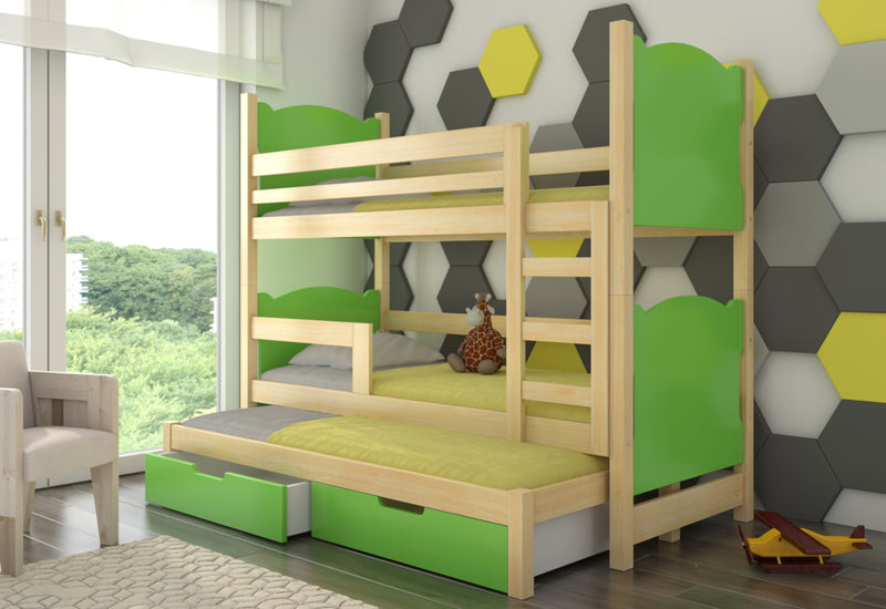 Detská poschodová posteľ LETIA 2. Detská poschodová posteľ zaujme svojou jednoduchosťou doplnenou pastelovými farbami. Je vyrobená z borovicového dreva v kombinácii s kvalitným laminom opatreným ABS hranou, ktorá chráni pred mechanickým poškodením. Komfort zaručí matrac z kvalitnej PUR peny s roštom, ktoré sú súčasťou postele. V spodnej časti nájdete prístelku pod ktorou sa nachádza úložný priestor v podobe dvoch šuplíkov. Pre pohodlné otváranie sú šuplíky opatrené výrezom. Možnosť výberu z viacerých farieb.