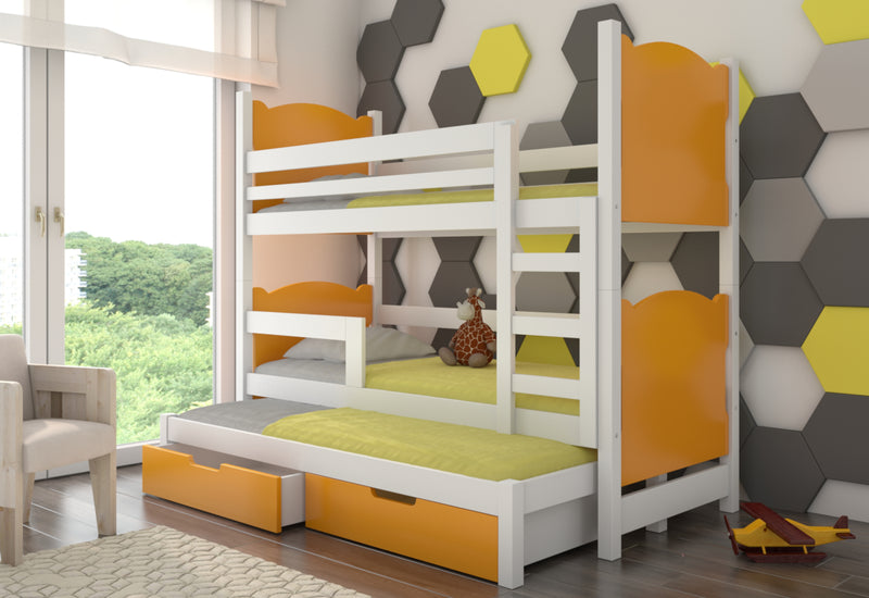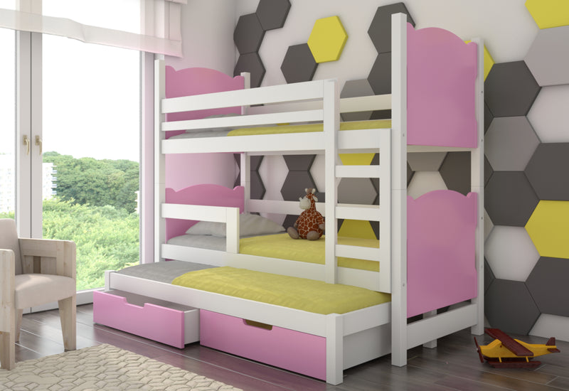 Detská poschodová posteľ LETIA. Detská poschodová posteľ zaujme svojou jednoduchosťou doplnenou pastelovými farbami. Je vyrobená z kvalitného lamina s ABS hranou, ktorá chráni pred mechanickým poškodením. Komfort zaručí matrac z kvalitnej PUR peny s roštom, ktoré sú súčasťou postele. V spodnej časti nájdete prístelku a pod ňou úložný priestor v podobe dvoch šuplíkov. Pre pohodlné otváranie sú šuplíky opatrené výrezom. Možnosť výberu z viacerých farieb.