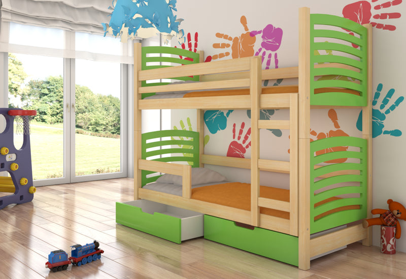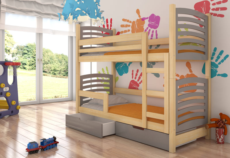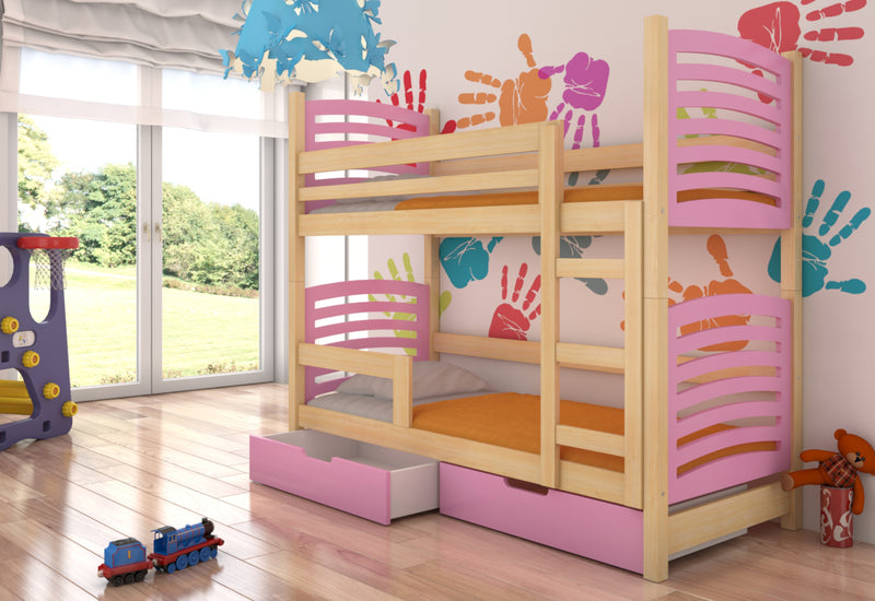 Detská poschodová posteľ OSINA 2. Detská poschodová posteľ zaujme svojou jednoduchosťou doplnenou pastelovými farbami. Je vyrobená z borovicového dreva v kombinácii s kvalitným laminom s ABS hranou, ktorá chráni pred mechanickým poškodením. Komfort zaručí matrac z kvalitnej PUR peny s roštom, ktoré sú súčasťou postele. V spodnej časti nájdete úložný priestor v podobe dvoch šuplíkov. Pre pohodlné otváranie sú šuplíky opatrené výrezom. Možnosť výberu z viacerých farieb.