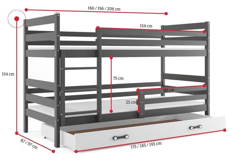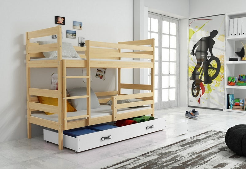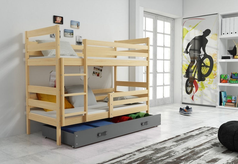 Detská poschodová posteľ RAFAL 2. Má pevnú konštrukciu z borovicového dreva. Povrch postele je trikrát lakovaný, čím je zaručená jasnosť a trvanlivosť farieb. Bezpečie zariadi zaoblené hrany. Posteľ dodávame vrátane matracov a roštov.