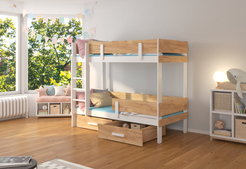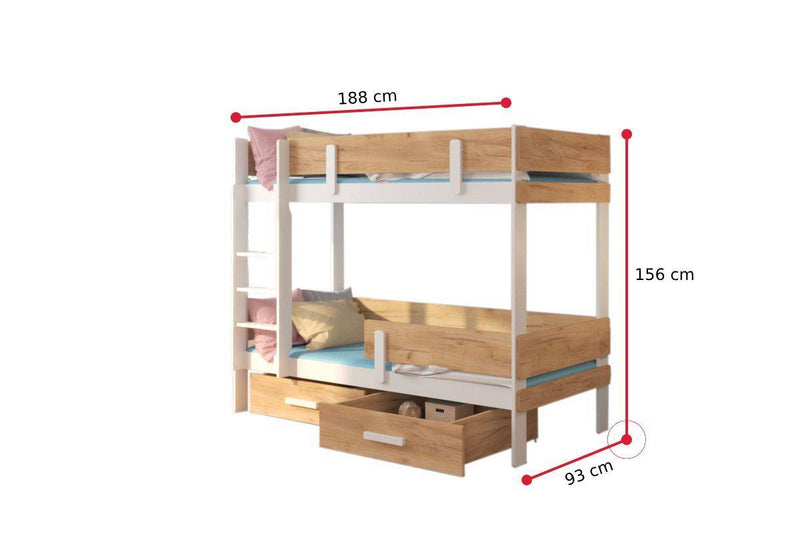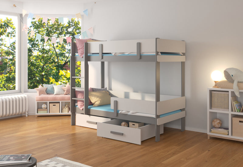 Detská poschodová posteľ SETINA. Zaujme moderným vzhľadom. Vyrobená je v kombinácii borovicového dreva s kvalitným materialom s hrúbkou 1,8 cm. Vybavené ABS hranou, ktorá chráni pred mechanickým poškodením. Komfort zaručí matrac z kvalitnej PUR peny s roštom, ktoré sú súčasťou postele. V spodnej časti nájdete úložný priestor v podobe dvoch zásuviek na kolieskach. Pre pohodlné otváranie sú zásuvky opatrené úchytmi. Možnosť výberu z viacerých farieb.