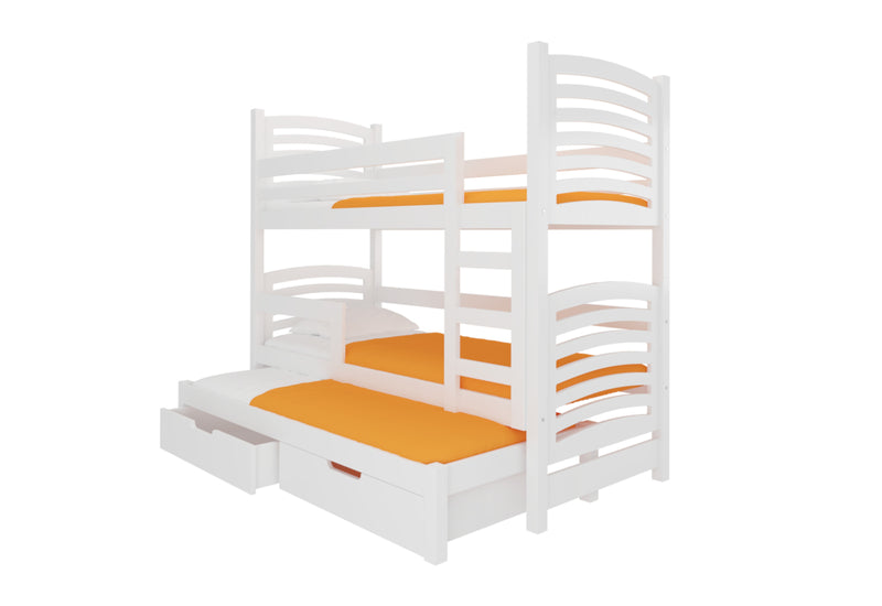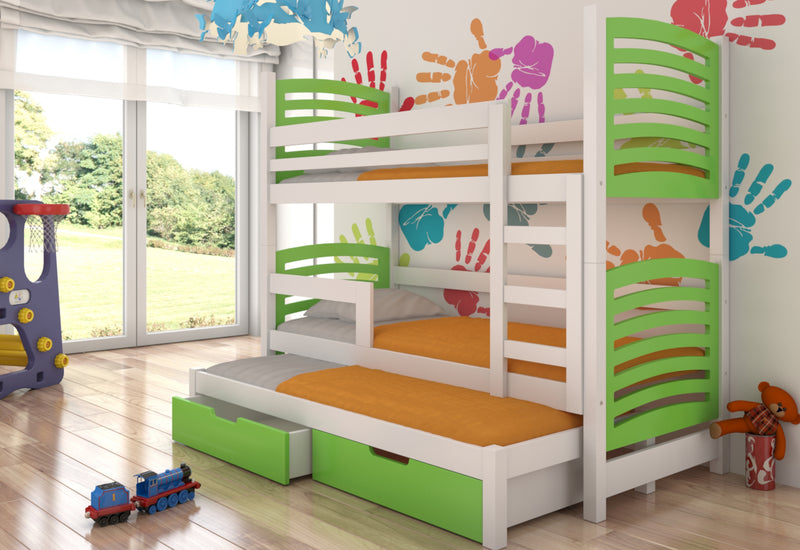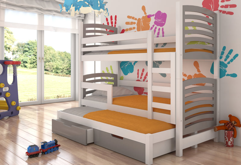 Detská poschodová posteľ SORTA. Detská poschodová posteľ zaujme svojou jednoduchosťou doplnenou pastelovými farbami. Je vyrobená z kvalitného lamina opatreným ABS hranou, ktorá chráni pred mechanickým poškodením. Komfort zaručí matrac z kvalitnej PUR peny s roštom, ktoré sú súčasťou postele. V spodnej časti nájdete prístelku a pod ňou úložný priestor v podobe dvoch šuplíkov. Pre pohodlné otváranie sú šuplíky opatrené výrezom. Možnosť výberu z viacerých farieb.