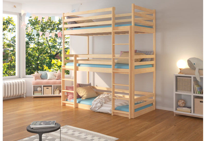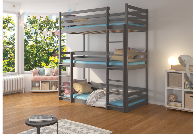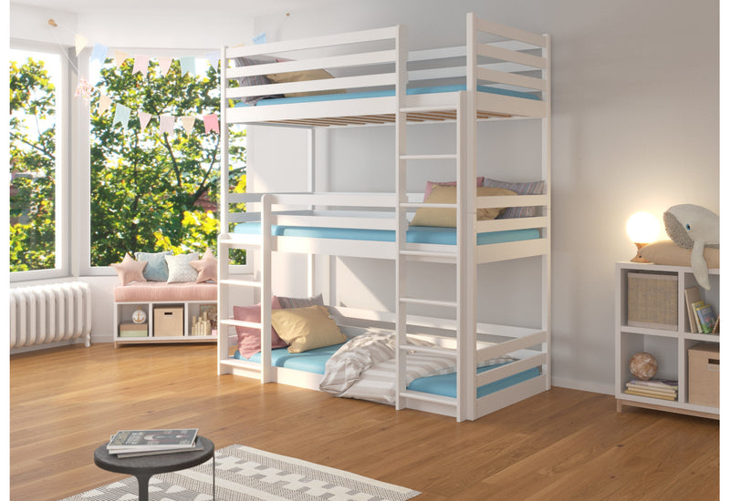 Detská poschodová posteľ TEDROS. Podstavec je vyrobený z kvalitného materiálu v rôznych farbách. Posteľ ponúka 3 poschodové postele nad sebou. Súčasťou postele sú 3 matrace v rozmeroch podľa spacej splochy. Zábrana zaistí bezpečie pri spaní na horných lôžkach. Univerzálna orientácia rebríka ponúka umiestnenie podľa potreby. Možnosť výberu spacej plochy a farby.