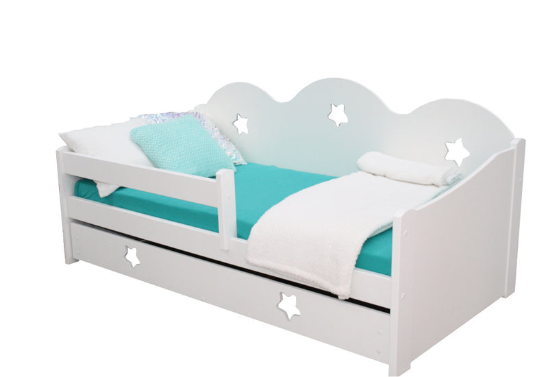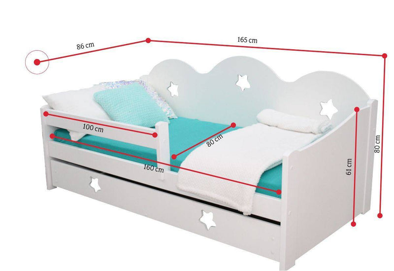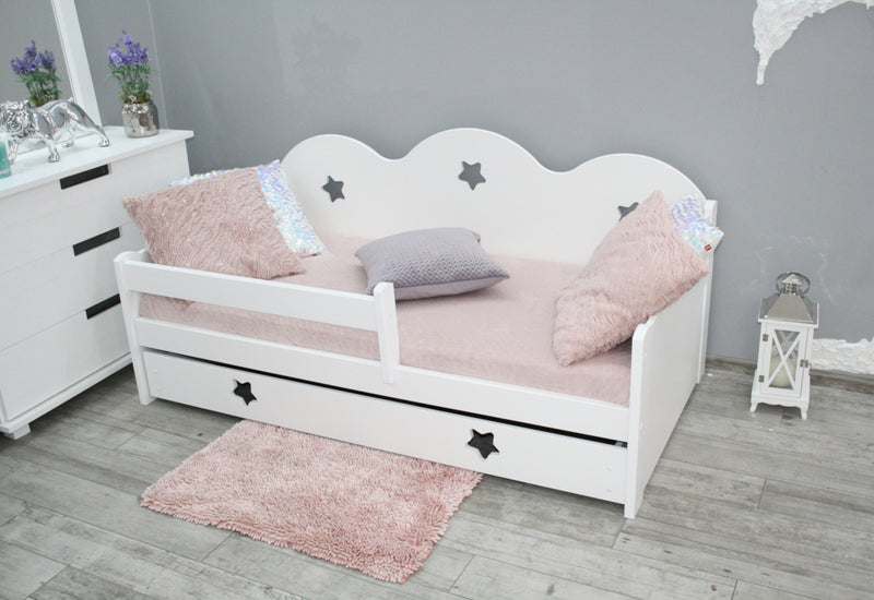 Detská posteľ AMIKA. Moderná posteľ do detskej izby, zdobená hviezdičkami. Vyrobená je z masívneho borovicového dreva v kombinácii s kvalitnou MDF doskou, zaistí tak stabilitu a pevnosť. Súčasťou detskej postele je zábrana a rošt. V spodnej časti postele nájdete úložný priestor v podobe zásuvky, ktorá je vybavená úchytmi v tvare hviezdičiek pre ľahké otváranie.