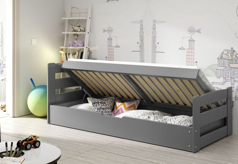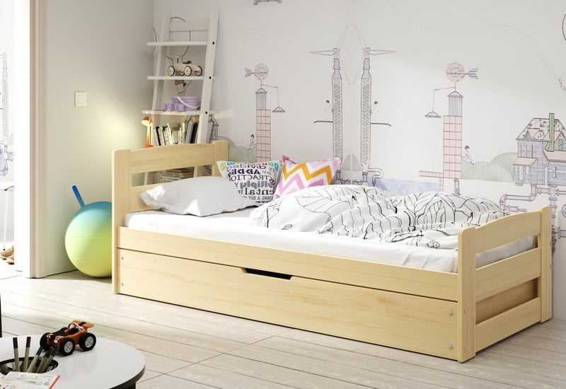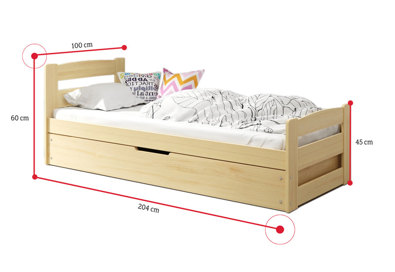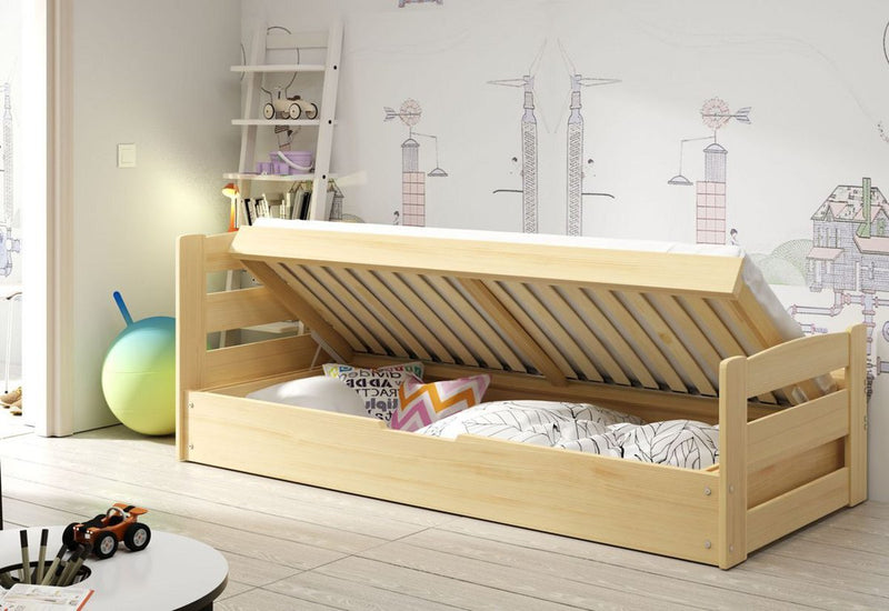 Detská posteľ ARDENT. Moderný a kvalitný nábytok do detskej izby. Vyvýšené čelo postele ponúkne relaxáciu počas dňa a úložný priestor, ktorý je prístupný vyklopením roštu zas ponúka dostatok miesta na odloženie posteľnej bielizne alebo hračiek. Konštrukcia postele je vyrobená z masívneho borovicového dreva. Tým máte zaručenú stabilitu a pevnosť. Výber dekoru dreva. K posteli dodávame zadarmo lamelový rošt FLEX a PUR penový matrac so snímateľným antialergickým poťahom.
