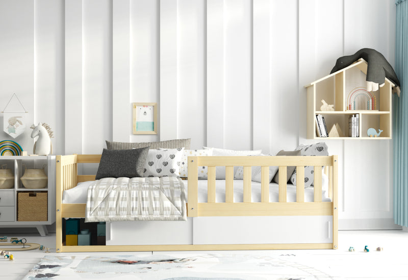 Detská posteľ BENEDIS. Moderná posteľ do detskej izby. Konštrukcia postele je vyrobená z kvalitného materiálu, zaistí tak stabilitu a pevnosť. Súčasťou je zábrana a rošt. V spodnej časti postele nájdete úložný priestor bez dna, ktorý je uzatvárateľný pomocou posuvných čiel s úchytmi pre ľahšiu manipuláciu. Dvierka úložného priestoru sú obojstranné a farbu dvierok si vyberiete počas montáže. Možnosť výberu z viacerých dekorov a voľby matraca.