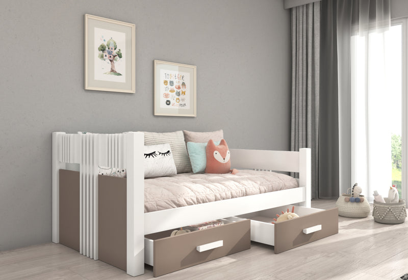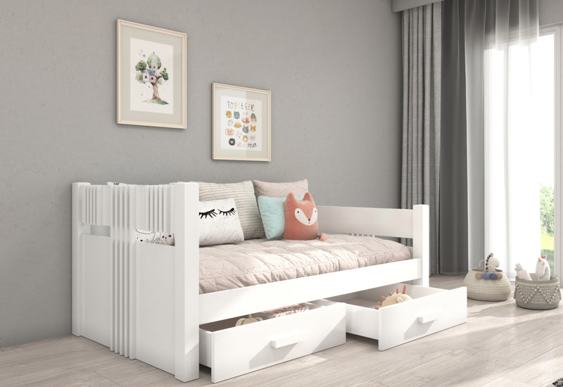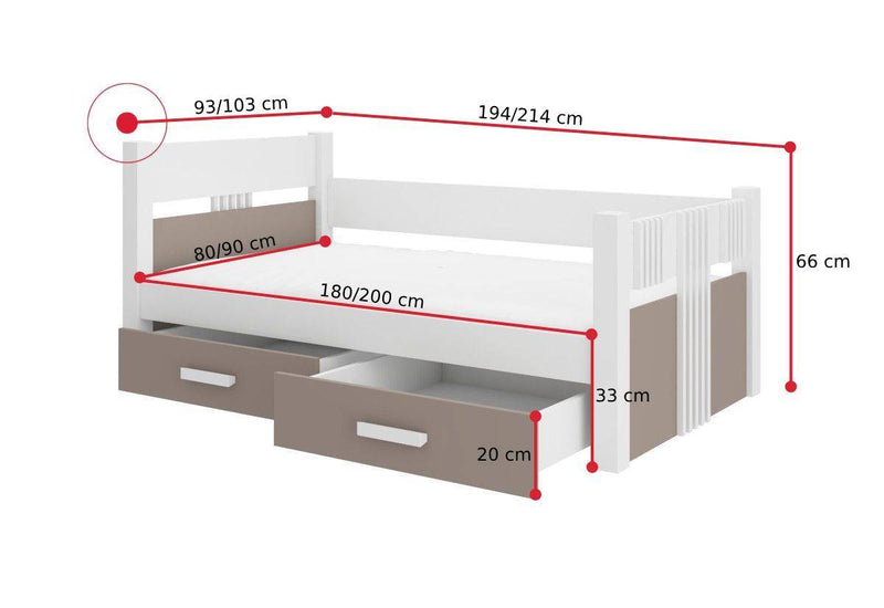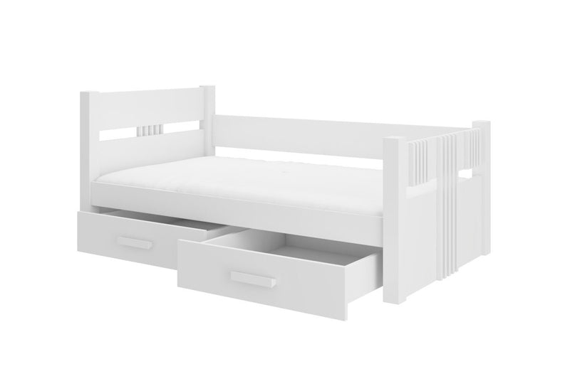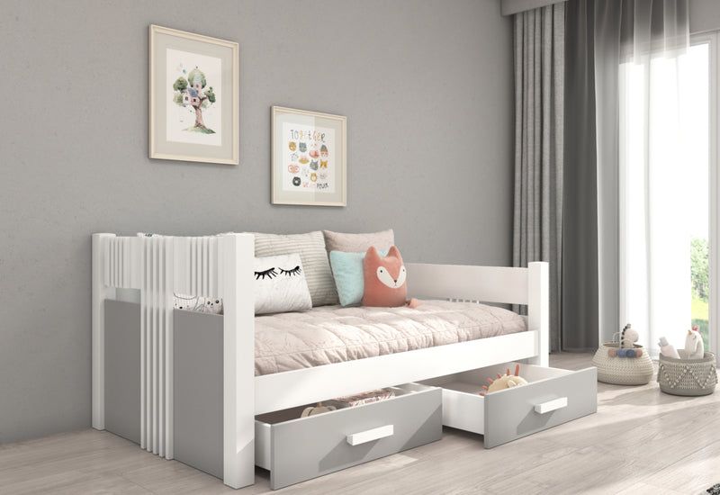 Detská posteľ BIMA. Zaujme svojim moderným a jednoduchým dizajnom. Základ tvorí pevná a stabilná konštrukcia z borovicového masívu v rôznych farebných variáciách. Posteľ je vybavená ABS hranami, ktoré ju chránia pred mechanickým poškodením a vlhkosťou. Súčasťou postele sú dva úložné priestory v podobe zásuviek pod posteľ. Súčasťou postele je lamelový rošt. Pre pohodlné otváranie sú zásuvky opatrené úchytmi. Možnosť výberu z viacerých dekorov, spacej plochy a voľby matraca.