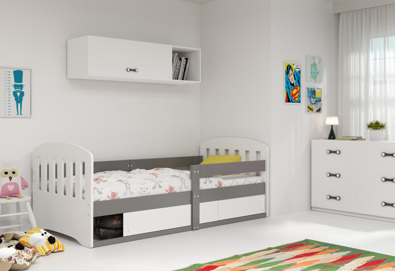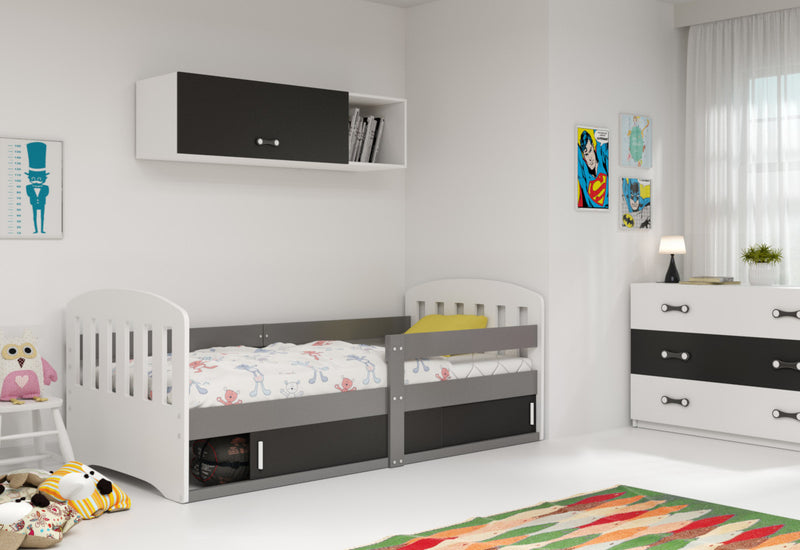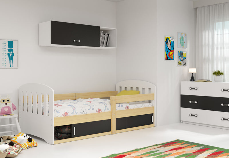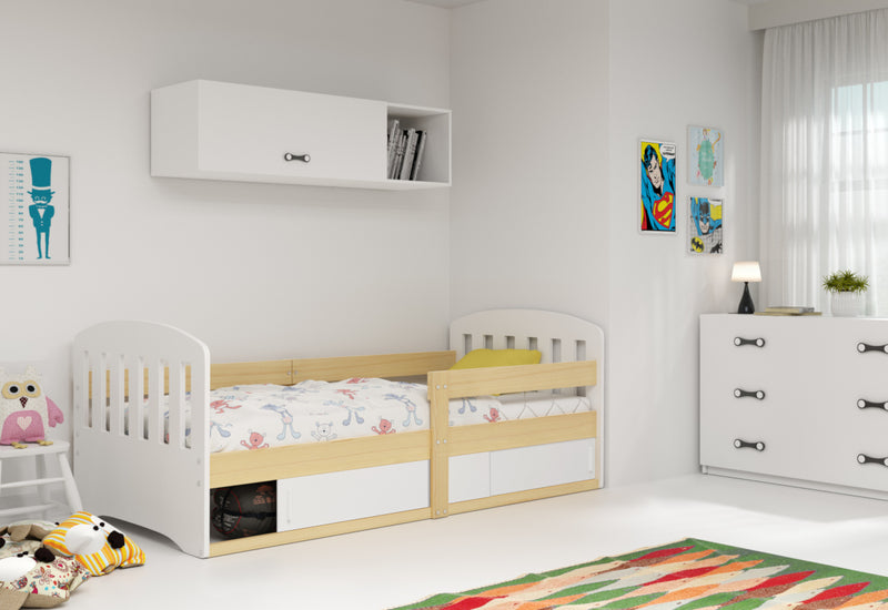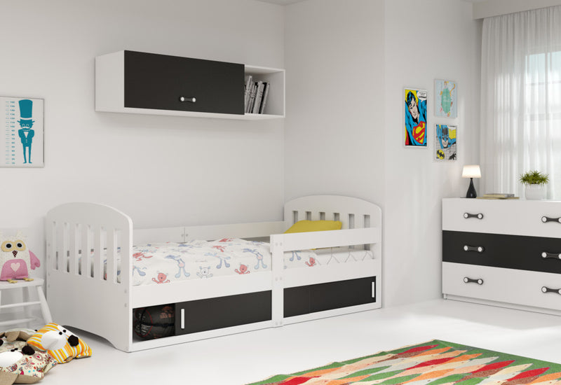 Detská posteľ CLASA. Moderná posteľ do detskej izby. Konštrukcia postele je vyrobená z kvalitného materiálu, zaistí tak stabilitu a pevnosť. Súčasťou je zábrana a rošt. V spodnej časti postele nájdete úložný priestor bez dna, ktorý je uzatvárateľný pomocou posuvných čiel s úchytmi pre ľahšiu manipuláciu. Možnosť výberu z viacerých dekorov a voľby matraca.