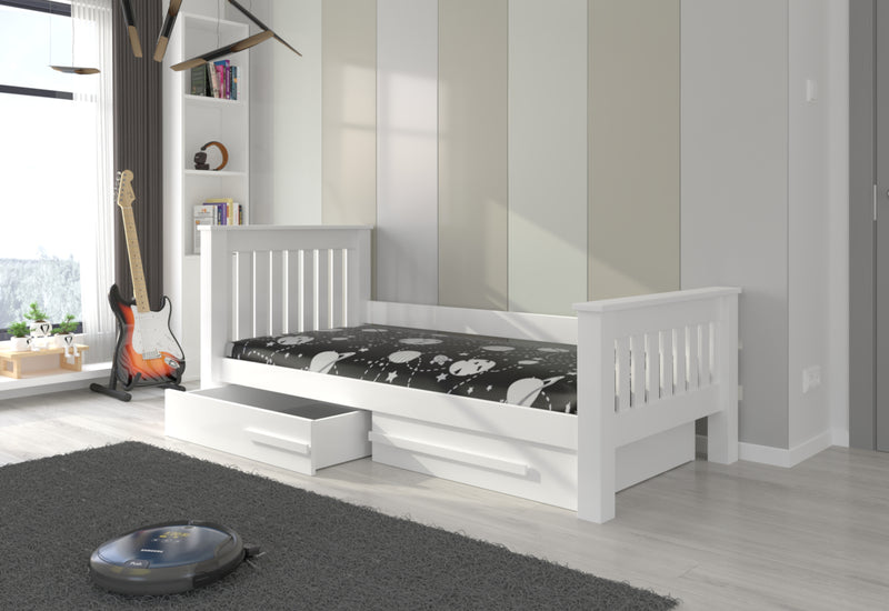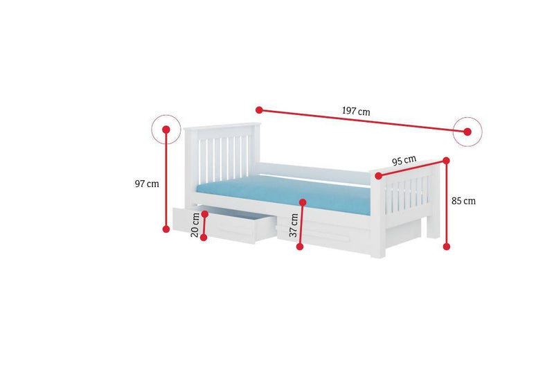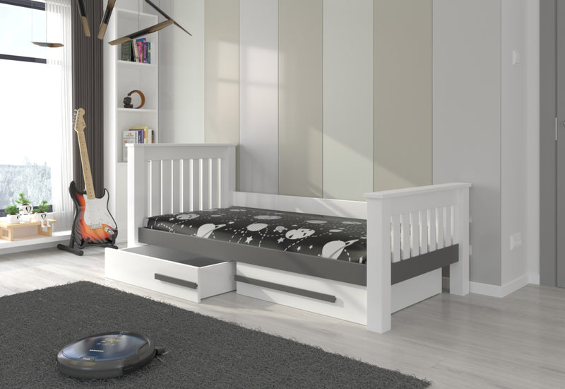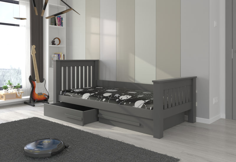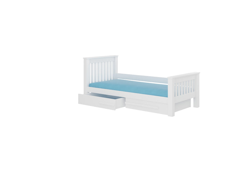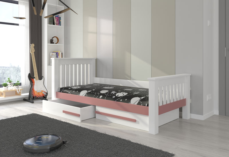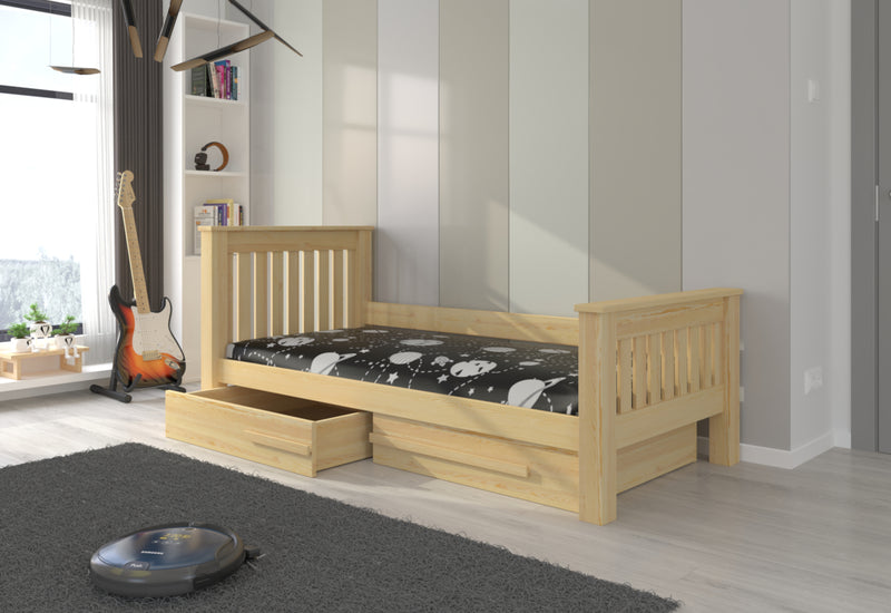 Detská posteľ ODILO. Základ tvorí pevná a stabilná konštrukcia z borovicového masívu v rôznych farebných variáciách. Súčasťou postele sú dva úložné priestory v podobe dvoch zásuviek na kolieskach. Pre pohodlné otváranie sú zásuvky opatrené úchytmi. Možnosť výberu z viacerých dekorov a voľby matraca.