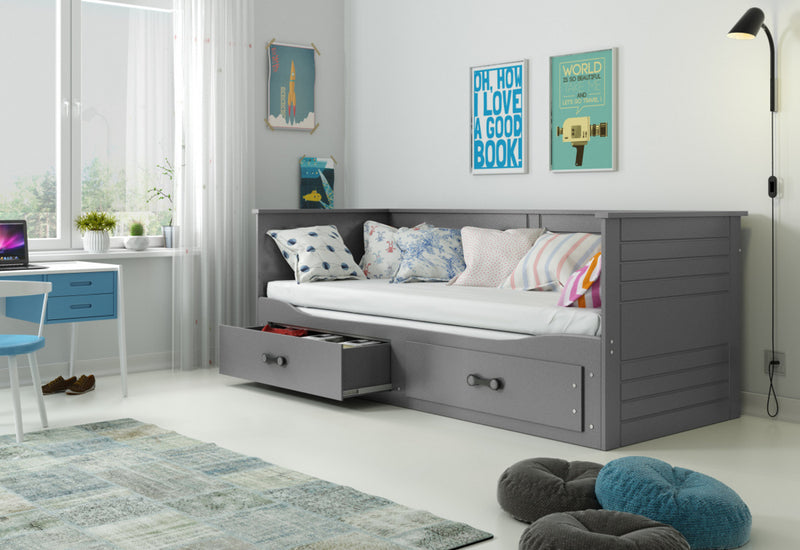 Detská posteľ OLYMP P2. Rám postele je vyrobený z pevného materiálu pre stabilitu a pevnosť postele. Čelá a boky postele sú z kvalitného materiálu s ochrannou vrstvou. Komfort zaručí matrac z kvalitnej PUR peny s antialergickým snímateľným poťahom spoločne s roštom Flex, ktorý je zostavený z pružných doštičiek. V spodnej časti nájdete úložný priestor a tiež prístelku. Možnosť výberu farebných dekorov.