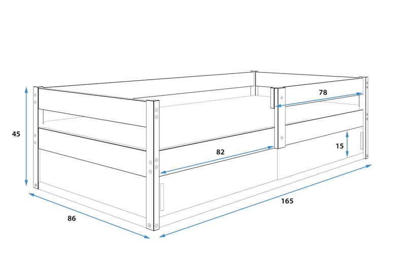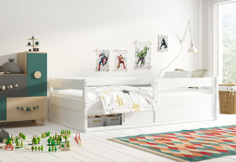 Detská posteľ POGO. Moderná posteľ do detskej izby. Konštrukcia postele je vyrobená z kvalitného materiálu, zaistí tak stabilitu a pevnosť. Súčasťou je zábrana a rošt. V spodnej časti postele nájdete úložný priestor bez dna, ktorý je uzatvárateľný pomocou posuvných čiel s úchytmi pre ľahšiu manipuláciu. Možnosť výberu z viacerých dekorov a voľby matraca.
