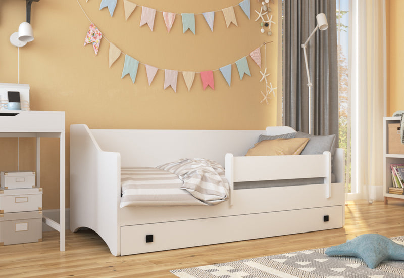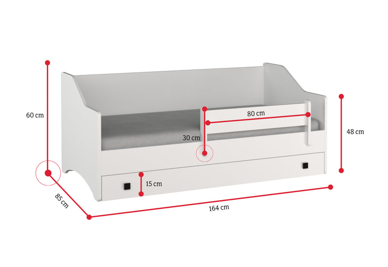 Detská posteľ RIDLEY. Moderná posteľ do detskej izby. Konštrukcia postele je vyrobená z kvalitného lamina, ktoré zaistí stabilitu a pevnosť. Snímateľná zábrana. V cene dodávame penový matrac a lamelový rošt. V spodnej časti postele nájdete úložný priestor na kolieskach.