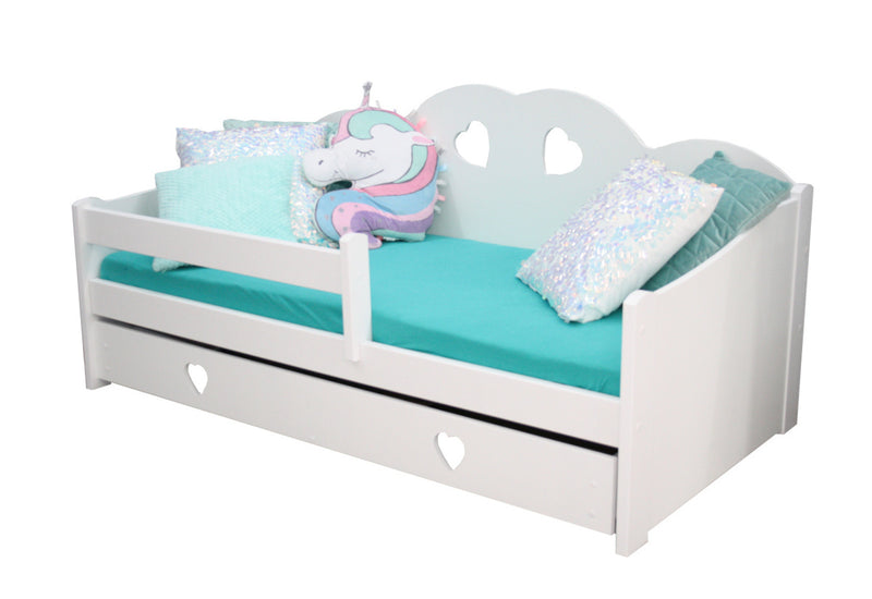Detská posteľ TASHA. Moderná posteľ do detskej izby, zdobená srdiečkami. Vyrobená je z masívneho borovicového dreva v kombinácii s kvalitnou MDF doskou, zaistí tak stabilitu a pevnosť. Súčasťou detskej postele je zábrana a rošt. V spodnej časti postele nájdete úložný priestor v podobe zásuvky, ktorá je opatrená úchytmi v tvare srdiečok.pre ľahké otváranie.