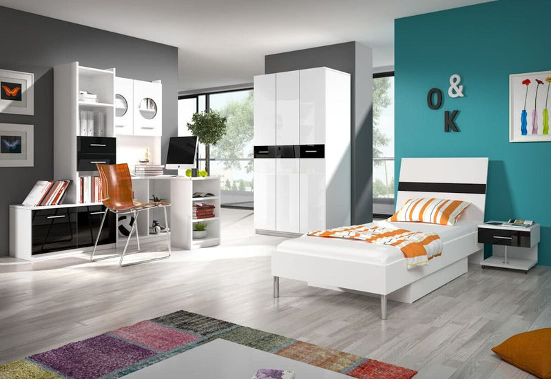 Detská skriňa DARCY je vyrobená z lamina. Poskytuje dostatok úložného priestoru vo forme políc a otvoreného priestoru s tyčou. Korpus skrine je v bielej matnej farbe. Mení sa len úzky pruh na prednej strane dverí v okolí úchytiek. Môžete si vybrať z niekoľkých farieb pruhu, ktorý je v lesklom prevedení.