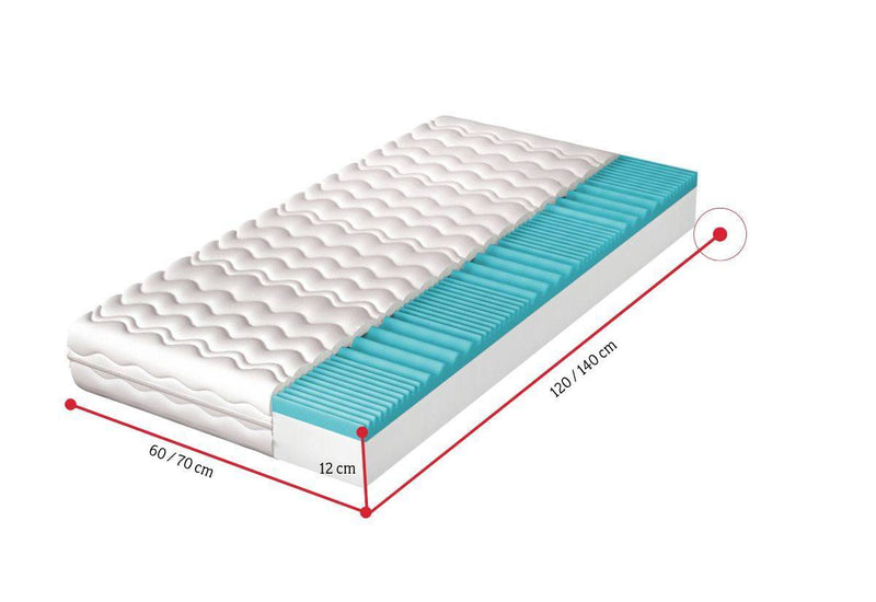 Detský penový matrac CARESA. Vyrobený je z kvalitnej PUR peny T25 strednej tuhosti. Matrac ponúka obojstranné použitie. Mimoriadne pevná pena s dobrou priepustnosťou vzduchu, ktorá poskytuje vynikajúcu tepelnú izoláciu. Nedeformuje sa, vďaka tomu je matrac veľmi pohodlný a zaručuje komfortný spánok. Vysoko kvalitná pena poskytuje veľmi dobrú oporu chrbtici. Štruktúra látky poťahu zaisťuje dostatočné odvetrávanie a správne prúdenie vzduchu v matraci. Má všitý zips, vďaka ktorému je poťah snímateľný a prateľný na 30 °C. Výška matraca je 12 cm vrátane poťahu.